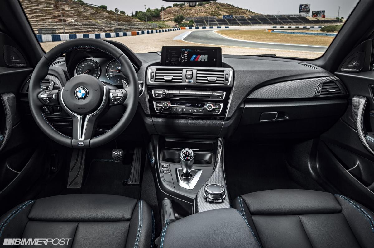 Bereits auf den ersten Blick ist das neue BMW M2 Coupé als Mitglied der BMW M Familie zu erkennen und unterstreicht auch optisch seine betont fahrdynamische Auslegung. Inspiriert von Modellen der BMW Motorsport-Historie, signalisiert das neue BMW M2 Coupé deutlich sein außergewöhnliches Leistungspotenzial. Dazu tragen die tiefgezogene Frontschürze mit den großen Lufteinlässen, seine muskulösen Flanken mit charakteristischen M Kiemenelementen, die 19-Zoll-Aluminiumräder im M typischen Doppelspeichen-Design und die flache und breite Heckpartie mit der M spezifischen Doppelendrohr-Abgasanlage eindrucksvoll bei. Der BMW M typische Charakter kommt ebenso bei der Gestaltung des Interieurs zum Ausdruck. Die Verwendung von Alcantara für die Türspiegel und die Mittelkonsole sowie offenporiges Carbon vermitteln ein sehr hochwertiges und zugleich sportliches Ambiente, das blaue Kontrastnähte und M Prägungen auf ausgesuchten Details zusätzlich betonen. Mit Sportsitzen, M Sportlenkrad und M Schalthebel hat der BMW M2 Fahrer jederzeit die perfekte Kontrolle über sein Fahrzeug.