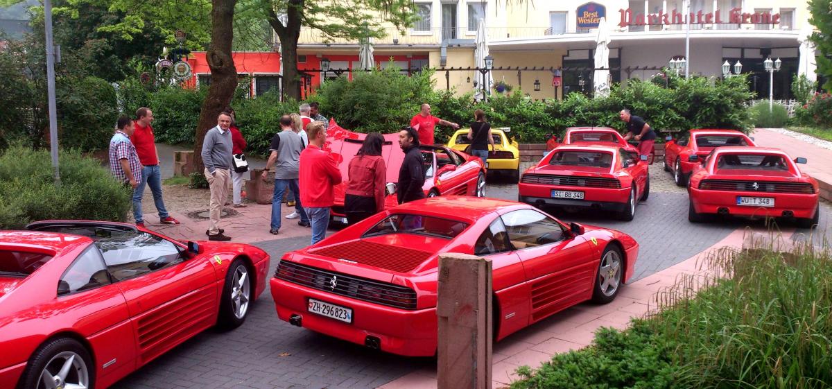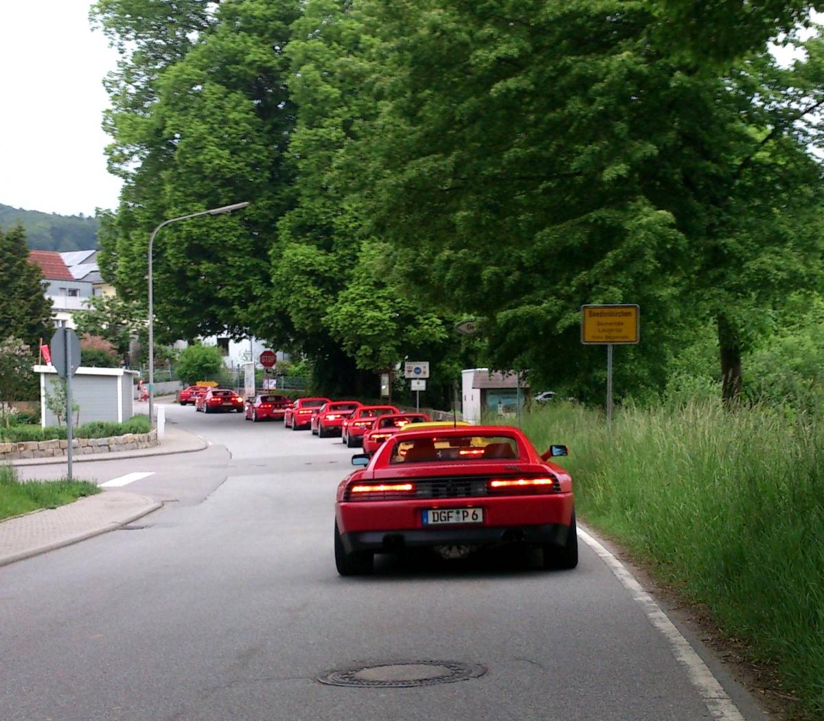 Den von mir anvisierten Teilnehmerrekord haben wir zwar verfehlt, aber vielleicht klappt es ja irgendwann mal:-))!. Leider haben fünf Teilnehmer ihre Zusage - witterungsbedingt - zurückgezogen und glänzten mit Abwesenheit. So konnten wir die Ausfahrt am Samstag gegen 9.45 in einer Gruppe mit zwölf Ferrari 348 starten. Neben zehn roten waren diesmal auch wieder zwei gelbe 348 anwesend. Davon befindet sich ein Exemplar im „Concourszustand“ und das andere gleicht einem „Restaurationsobjekt“, um einen Teilnehmer zu zitieren:sensationell:.