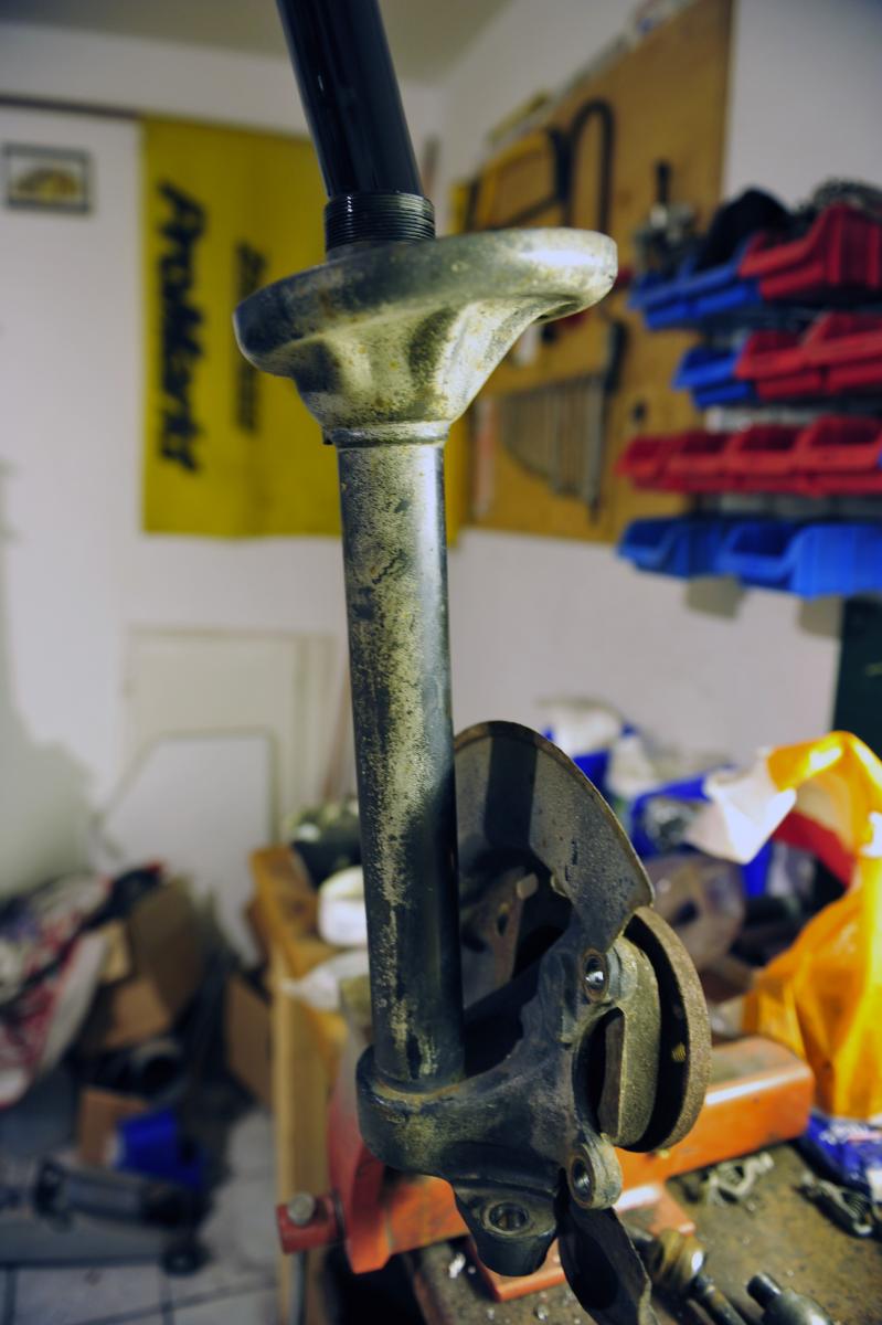 Hier nun wird die alte Dämpferkartusche aus dem Rohr des Federbeins gezogen. Im Rohr sind ca. 0,3l Motorenöl, um ein festbacken von Dämpferkartusche und Rohr zu verhindern. Und es funktioniert, nach 28 Jahren ging das ganz geschmeidig.