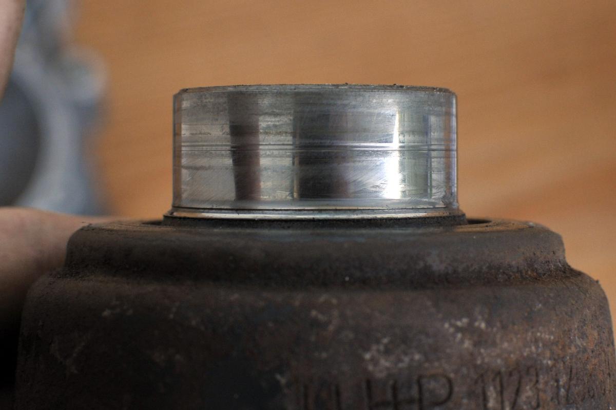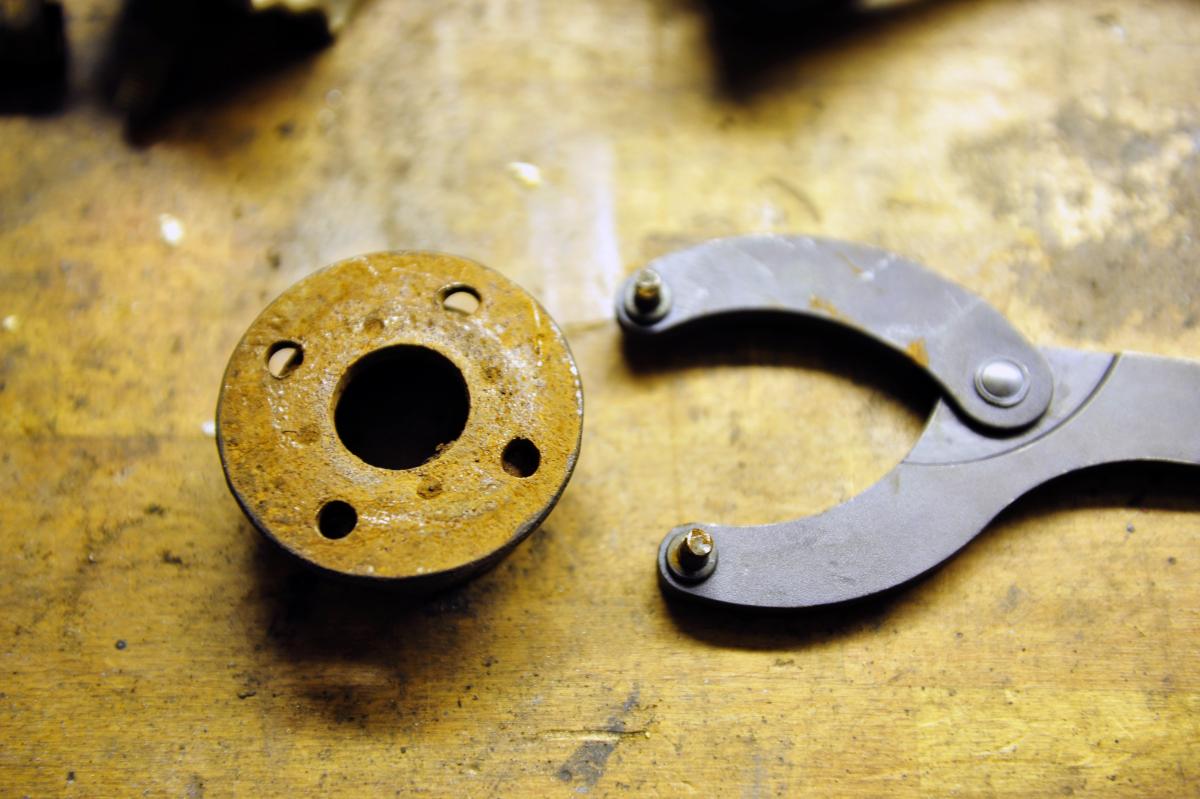 Was nicht so geschmeidig ging war die Demontage der Überwurfmutter auf der Dämpferkartusche. Als Werkzeug habe ich einen sogenannten „Gelenk-Stirnlochschlüssel 40 - 80mm mit Zapfen 5“ verwendet, der trotz Rostlöser und Gasbrenner ordentlich gelitten hat.