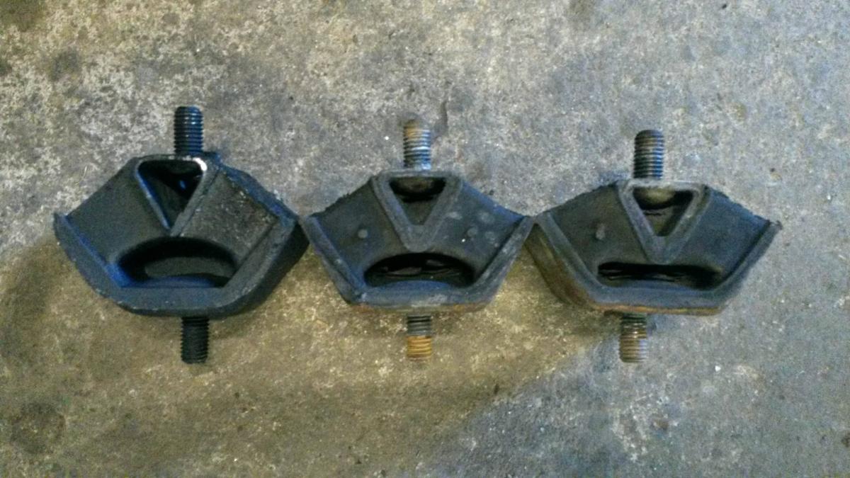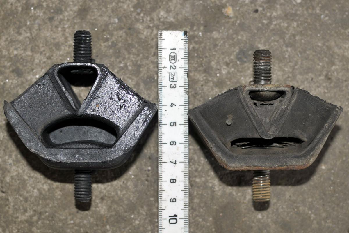 Die alten Motorlager hatte ich ja oben schonmal geposted, hier nochmal mit cm Maß. Das Resultat jahrzehntelanger Einwirkung der Schwerkraft in Kombination mit Hitze, Kälte und Schwingungen. Welch billiges Vergnügen (15€) das zu ändern.