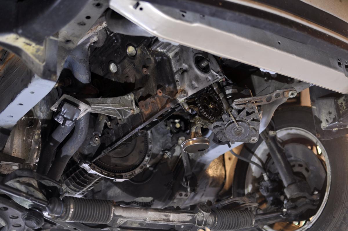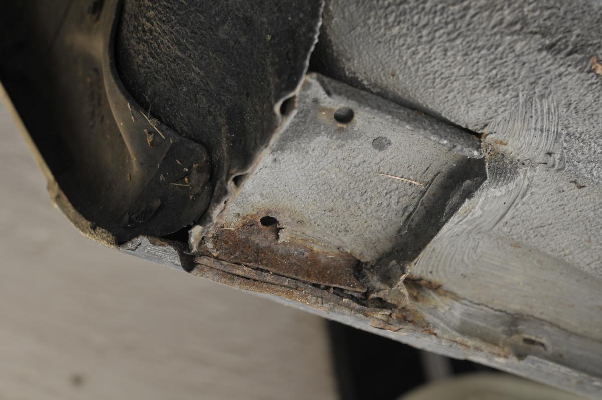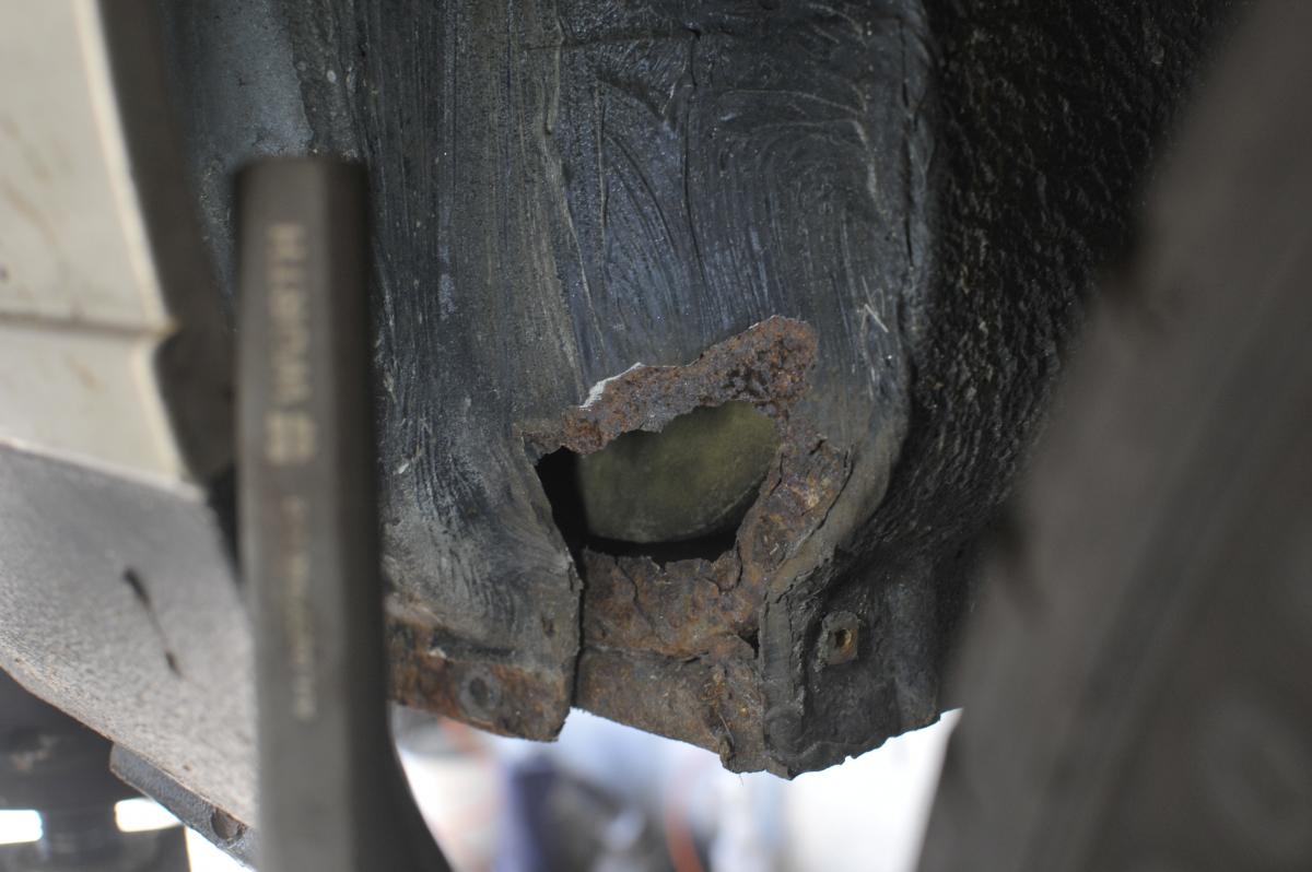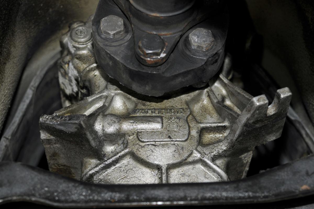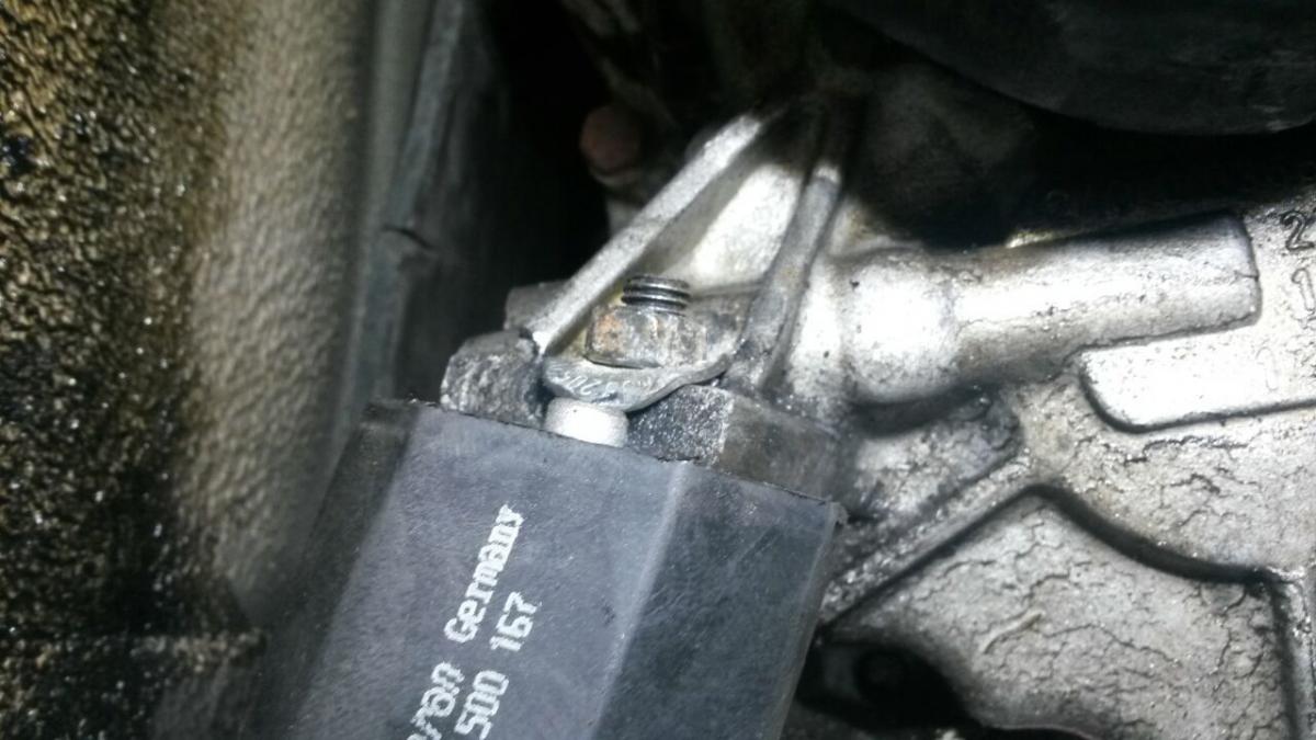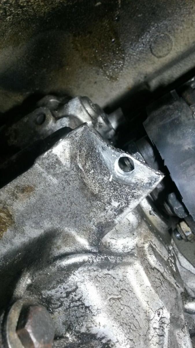 Ein Überraschungsei vom Vorbesitzer ist die links abgebrochene Lasche am Getriebe. Das war mit einer großen Unterlegscheibe "gesichert".