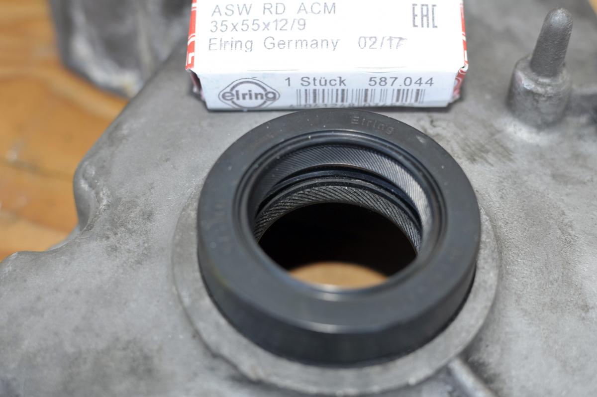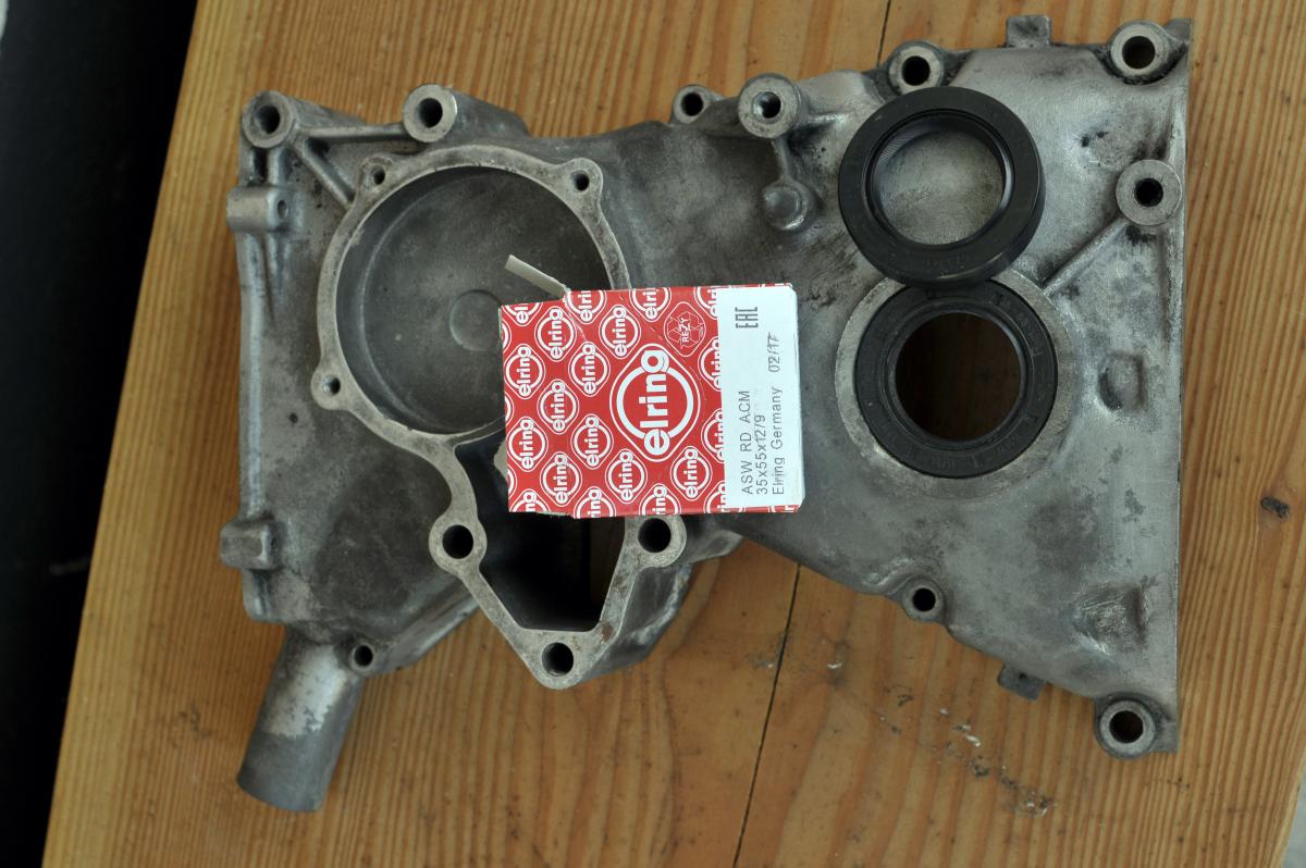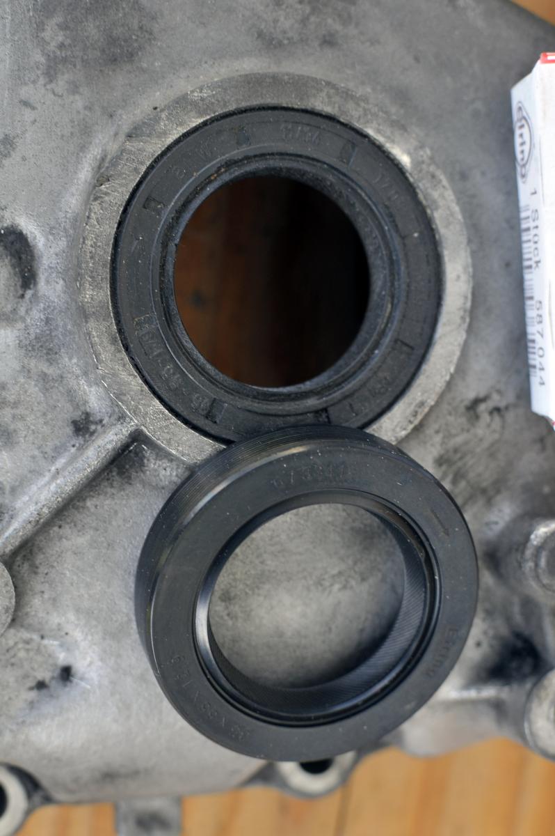 Die darin laufenden Riemenscheibe hat schon eine Rille auf der laufbahn, Gummi gegen Stahl hinterlässt halt auch Spuren. Da die Riemenscheibe aktuell 196€ kostet, habe ich den Wellendichtring einfach 2mm tiefer eingepresst als den alten. Nun läuft die neue Dichtlippe auf einer jungfräulichen Oberfläche und das reicht wieder für die nächsten 30 Jahre.