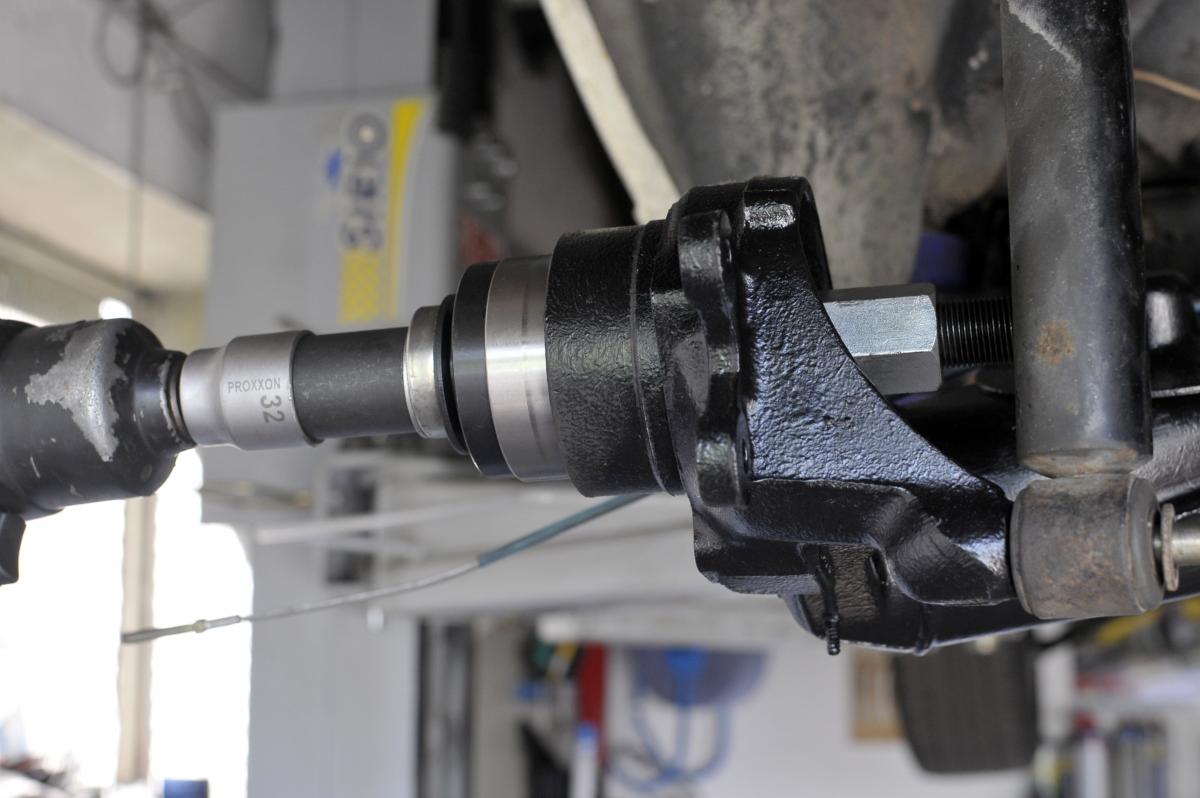 So ein Teil, wenn auch von Hazet, verwende ich auch. Und wenn der Zapfen trotzdem nicht raus will, dann dreh ich dieses Tool voll auf Spannung, hau sanft mit einem 5kg Hammer auf den Querlenker, und dann macht es peng.