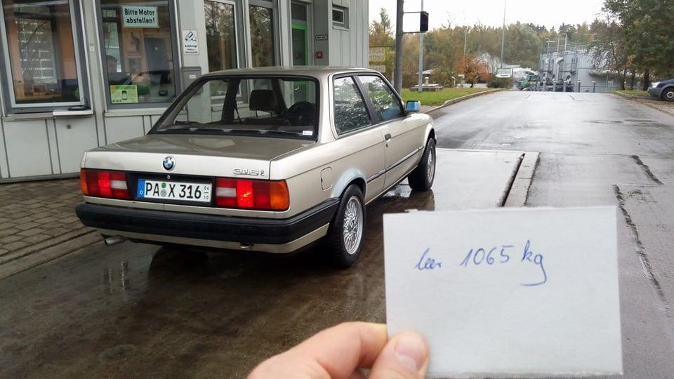 Die Woche habe ich den E30 mal wiegen lassen. Schlanke 1.065 kg mit folgenden Parametern: