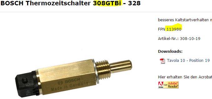 Der richtige Thermozeitschalter ist wohl der BOSCH F 026 T03 101. Aber: Habe momentan das Kaltstartventil nicht angeschlossen, bin kalt und warm zufrieden damit. Wenn ich den alten Kurzen tausche, dann eigentlich nur als Kür und möglichst soft. Da ist mir dann der BOSCH F 026 T03 102 lieber, da er schwächer eingreift. Der ist evtl. für 308QV und Testarossa, aber sicherlich auch ok für den 308GTSi US-Version.