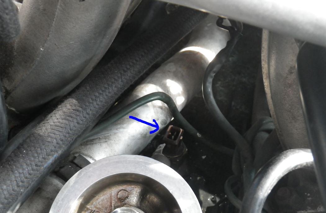 4. Alter Thermozeitschalter (blauer Pfeil) raus. 24er-Nuss. Hier öffnet man das Kühlsystem. Also an 3. denken.