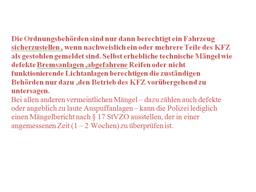 Aus dem entnehme ich dass eine - vermeintlich - zu laute Auspuffanlage nicht für eine Beschlagnahme ausreicht, jedoch innert 2 Wochen der Nachweis vom Besitzer erbracht werden muss.