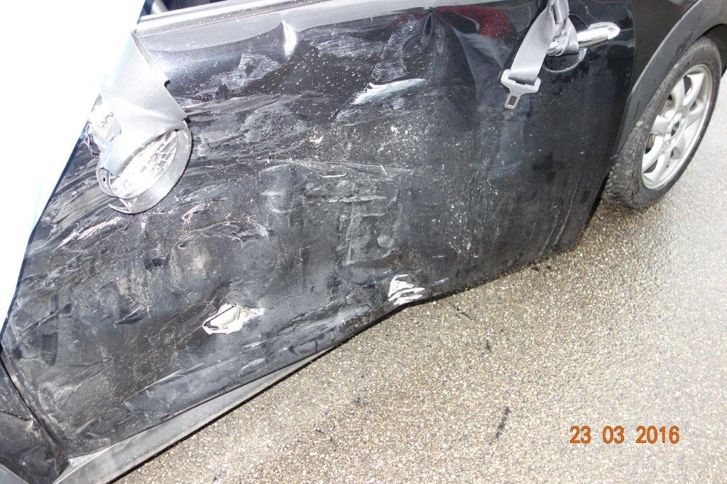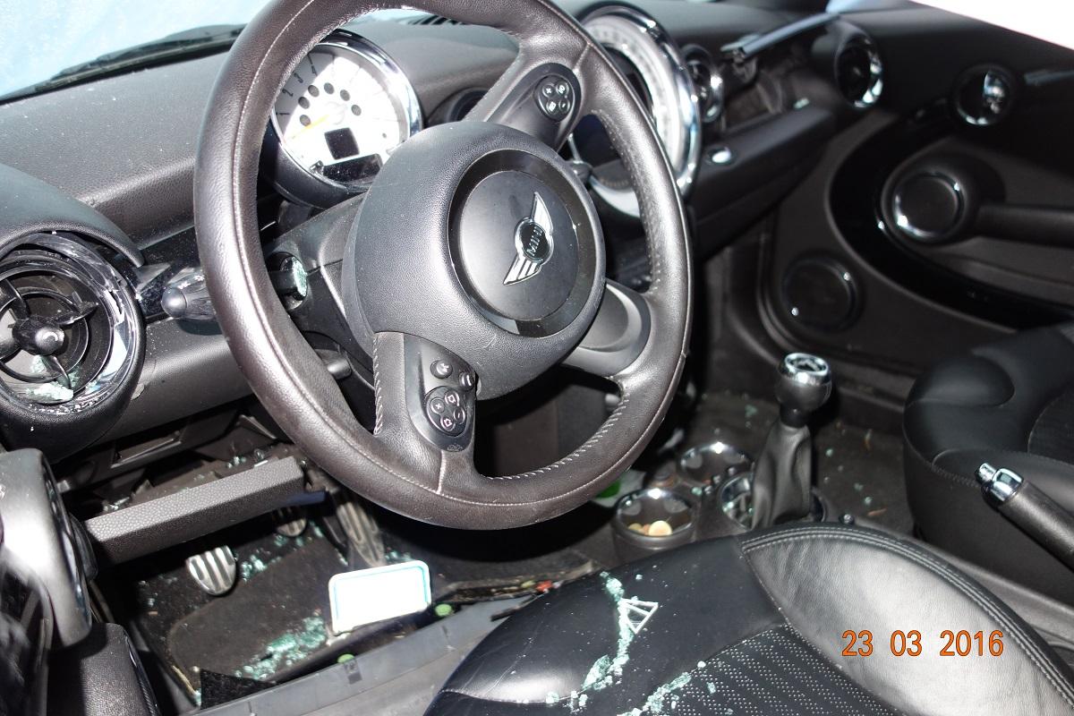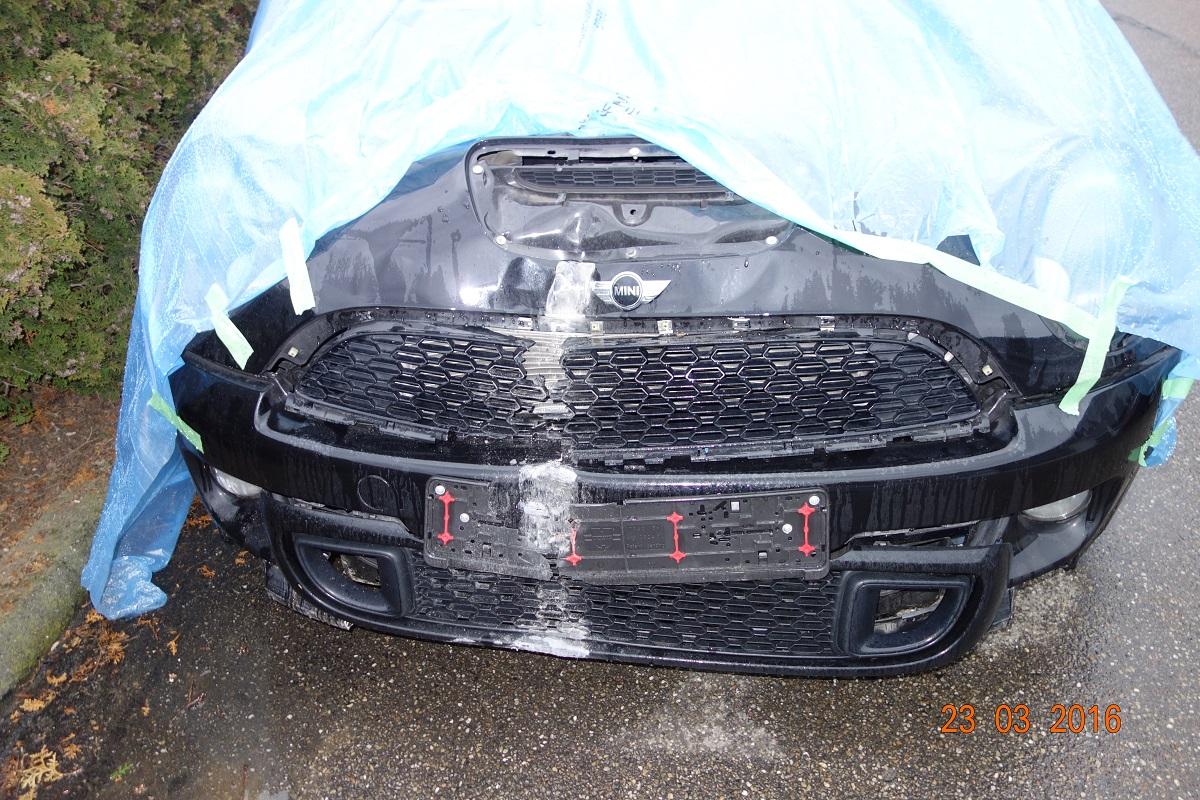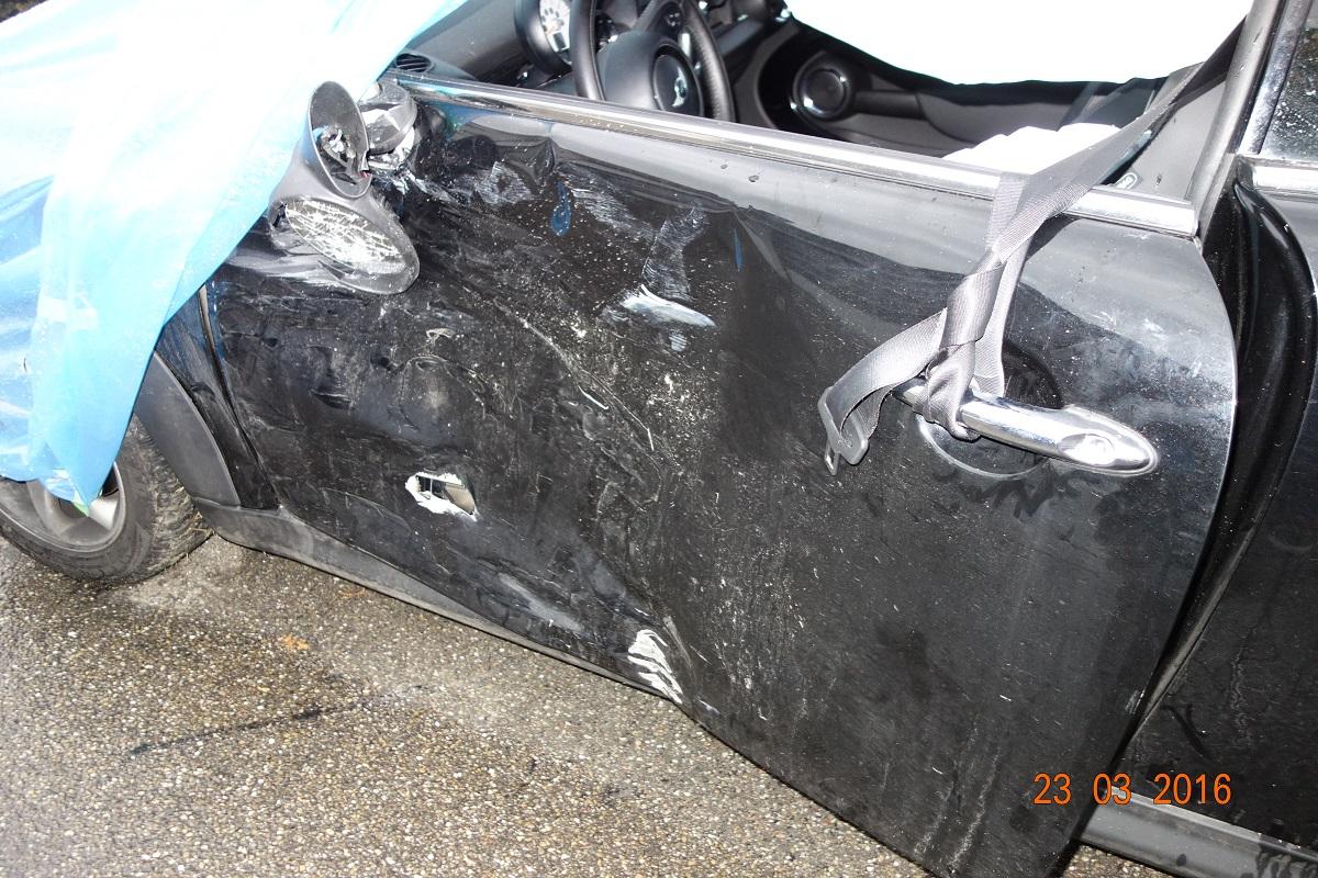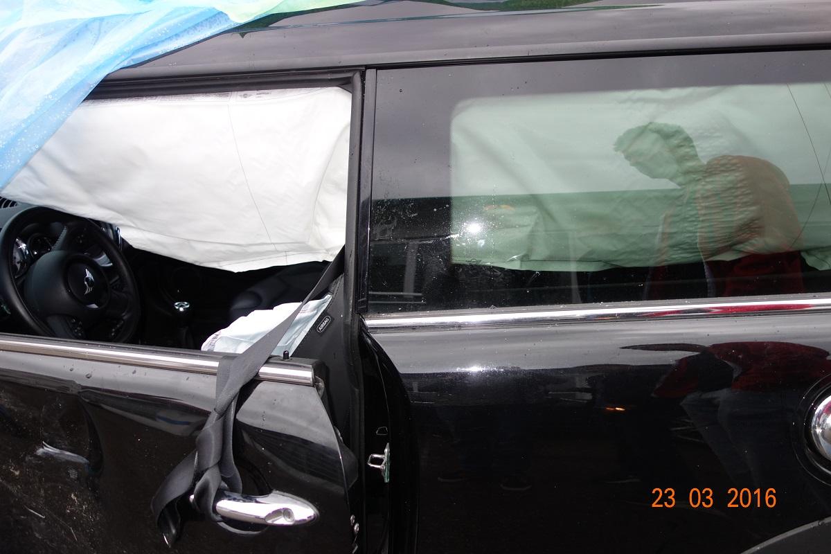 Der Mini scheint den damaligen 5Sterne Crashtest zu bestätigen, alle 3 Insassen stiegen unversehrt aus, obwohl selbst das Armaturenbrett gerissen war, der Zusammenstoß erfolgte frontal seitlich, der Mini wurde 10m auf einen massiven Doppelpfosten katapultiert worden, daher der zusätzliche Frontschaden.