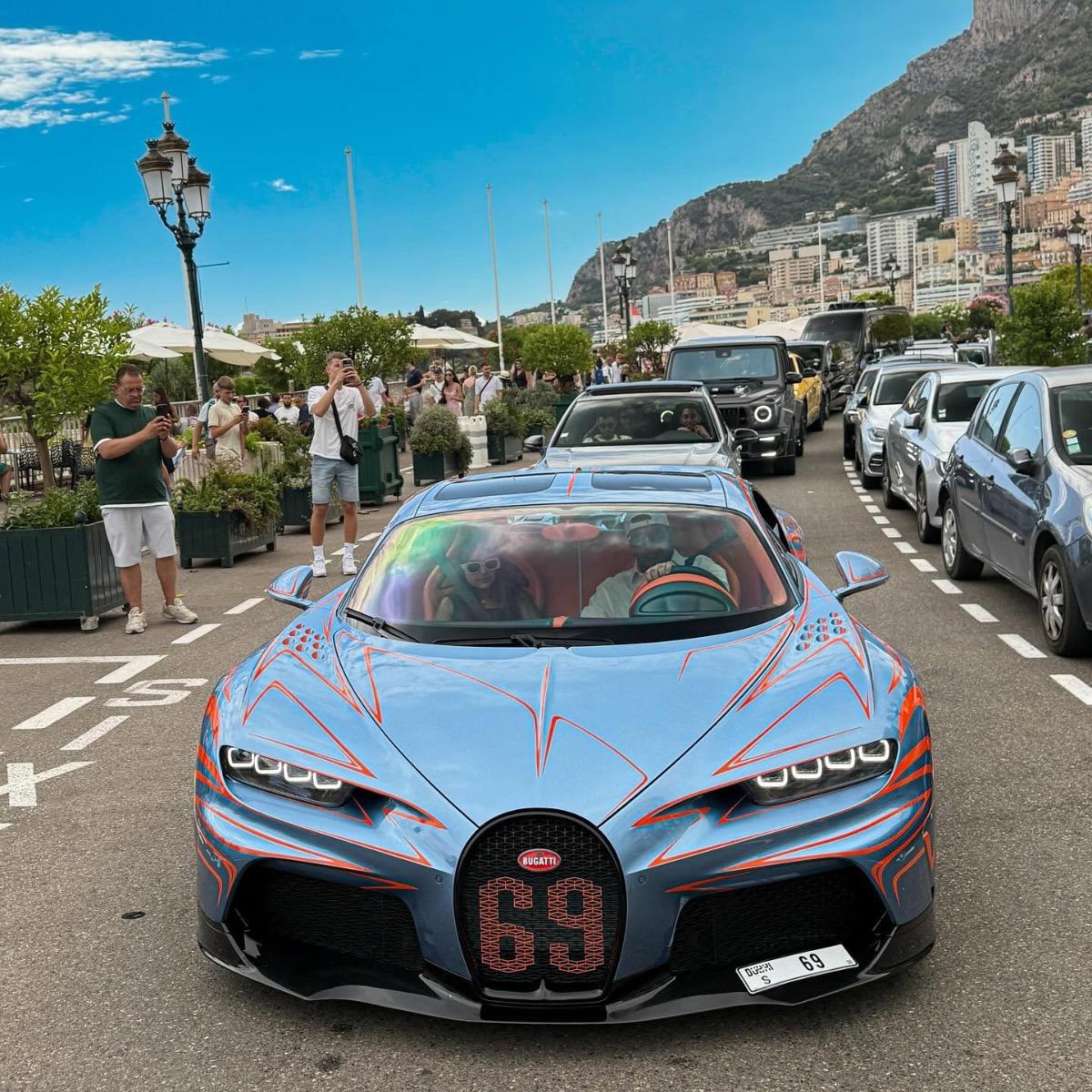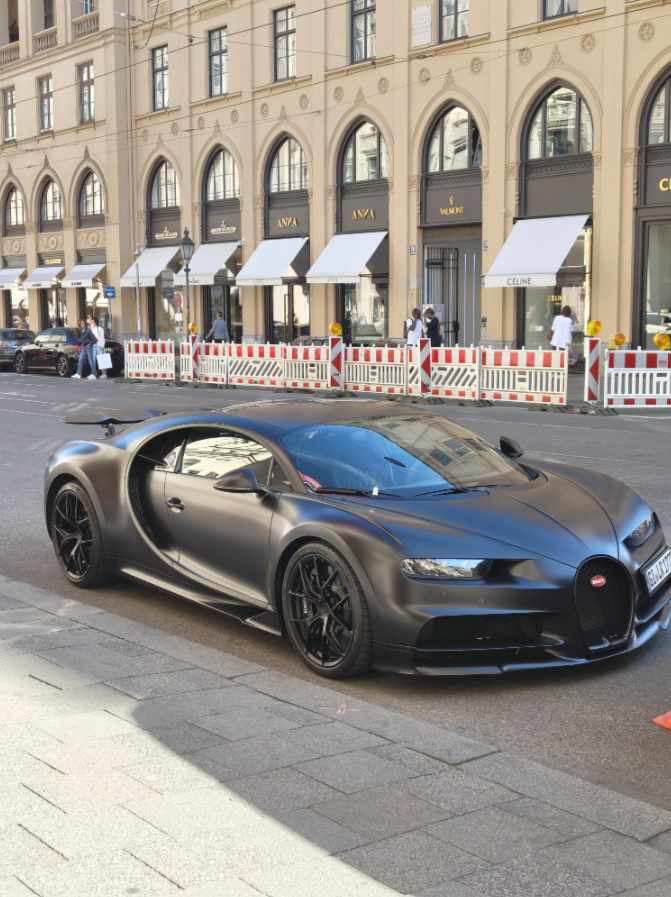 Die ganze Flotte von Mike Yin an der Shell. Da freut sich der Tankwart. Montana Plates auf dem Chiron, der in Deutschland unterwegs ist, ist auch... besonders.