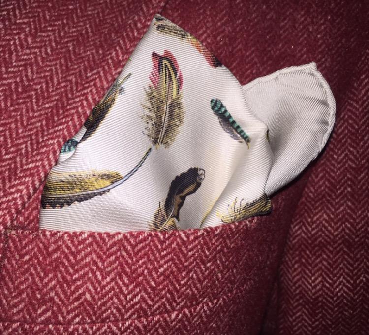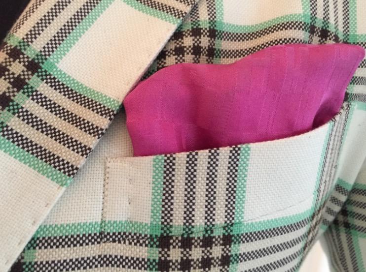 Und jetzt die wunderbare Kombination aus rosafarbener Seide und dunkelgrünem Leinen, nicht nur die Farbkombination, auch das Motiv des Pochettes ist etwas waidmännisch anghaucht: