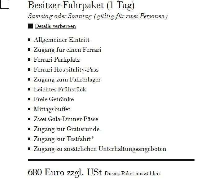 Habe mit  Fa Eberlein tel. und die nette Dame sagte mir, daß das kleinste Paket pro Person egal mit oder ohne Ferrari, das Hospitalitypackage für 200.- netto ist.