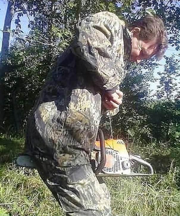 Er trägt keine Schutzbrille und keine Arbeitshandschuhe - geht mal gar nicht und kann dann auch mal in die Hose gehen;)