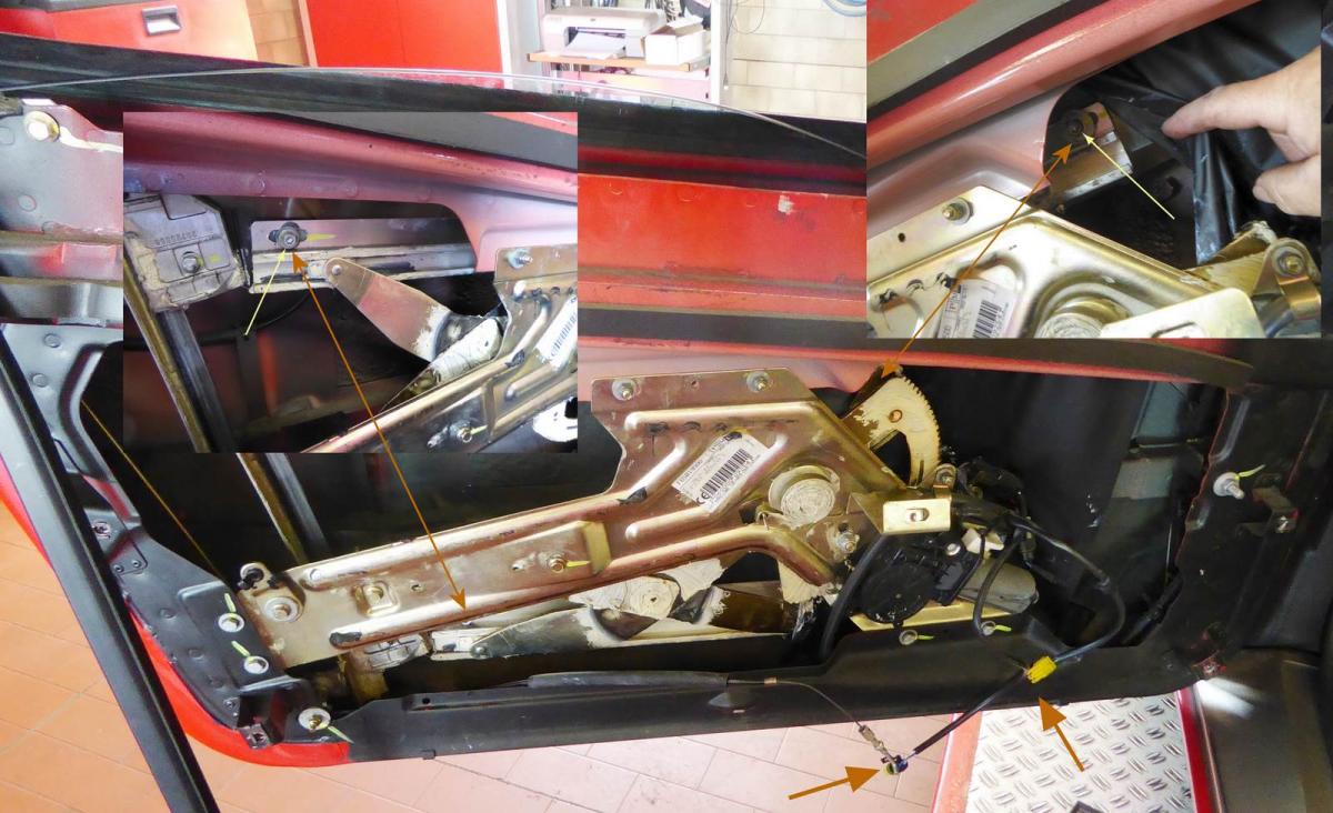 So wie ich es verstanden habe,  existiert beim 360er keine Schraube, die die Seitenscheibe im heruntergelassenen Zustand fixiert, sondern eine nur wenige cm hohe Plastikführung direkt unter den Dichtungen am hinteren Ende der Türe. Auch ist die Platikführung fest mit der Türe verbunden und nicht justierbar.