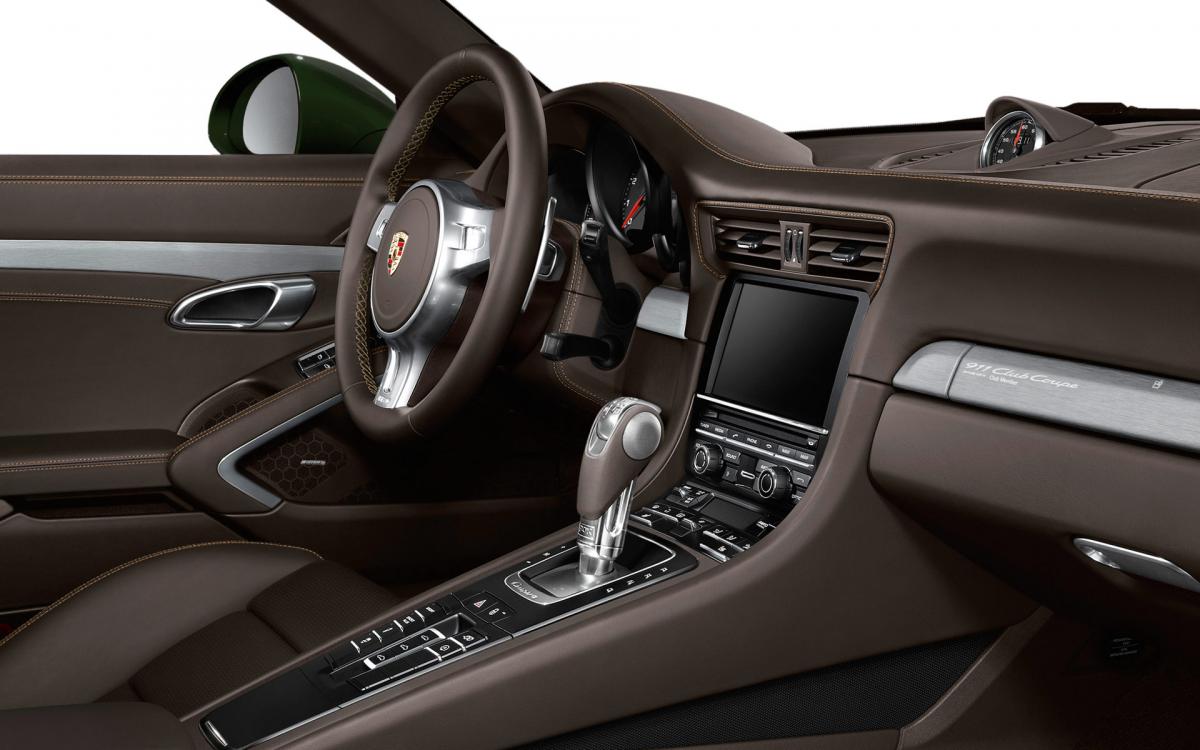 Porsche 991: Moccabraunes Leder mit orangenen Nähten. Kommt besonders gut bei einer Wagenfarbe in Dunkelgrün oder in Saphirblau zur Geltung: