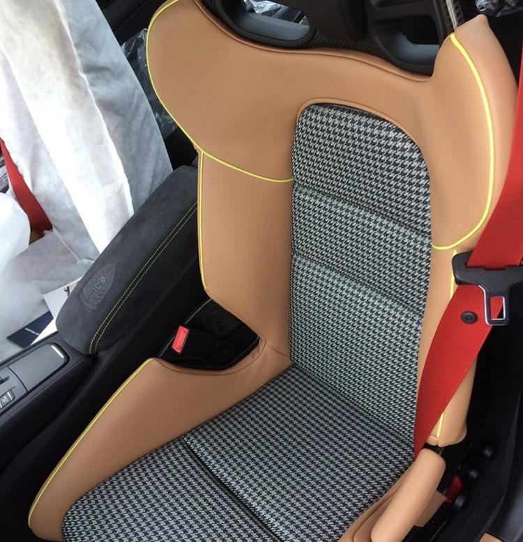 Sehr schöne Ideen, finde ich grundsätzlich super, wenn jemand so mutig ist. Drei Details versauen meiner Meinung aber die einmalige Optik. Erstens würde ich einem Sportsitz niemals eine Keder verpassen, das passt zu einem Rang Rover, aber nicht zu einem Sportwagen. Zweitens finde ich, das die Farbe acidgreen so überhaupt nicht zum Cognac-farbendem Leder passt. Und drittens ist es dadurch insgesamt viel zu unruhig/bunt, acidgreen, cognac, pepita, rot, schwarz das sind mindestens zwei Farben zuviel.
