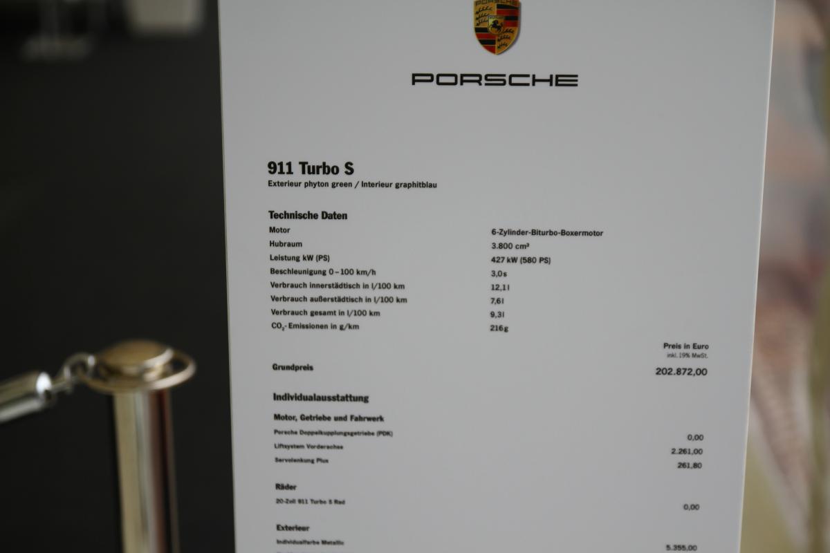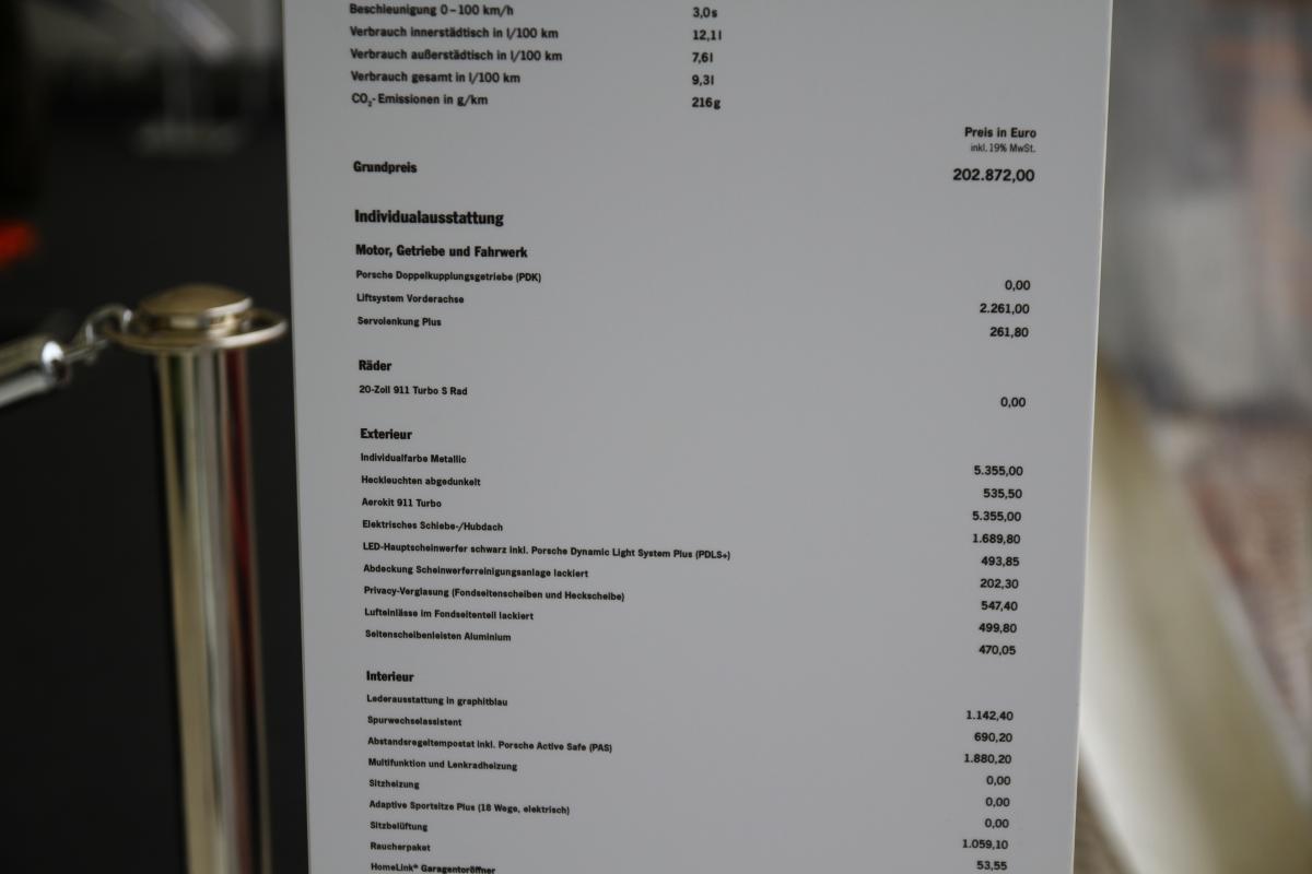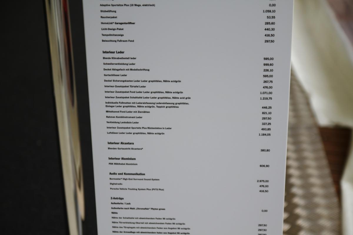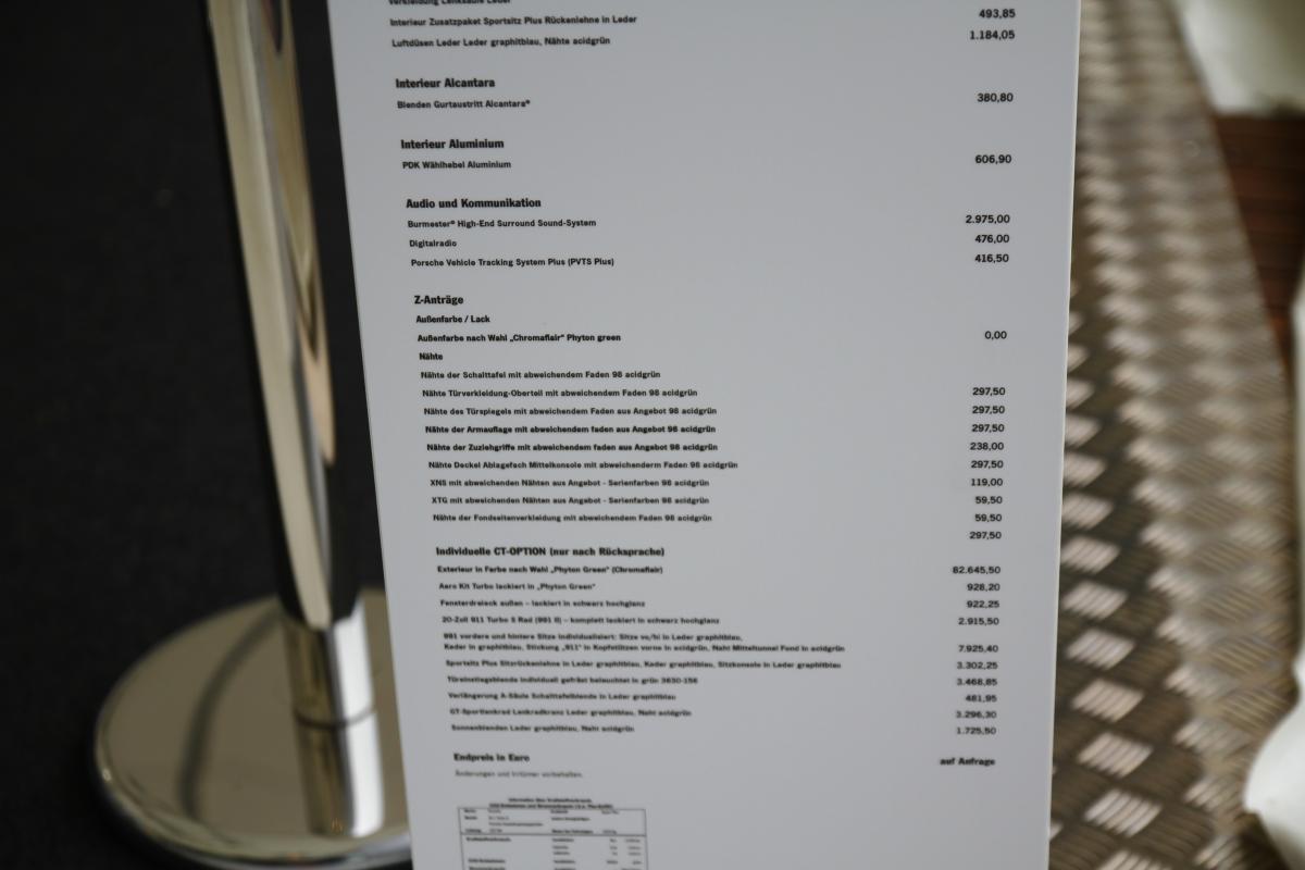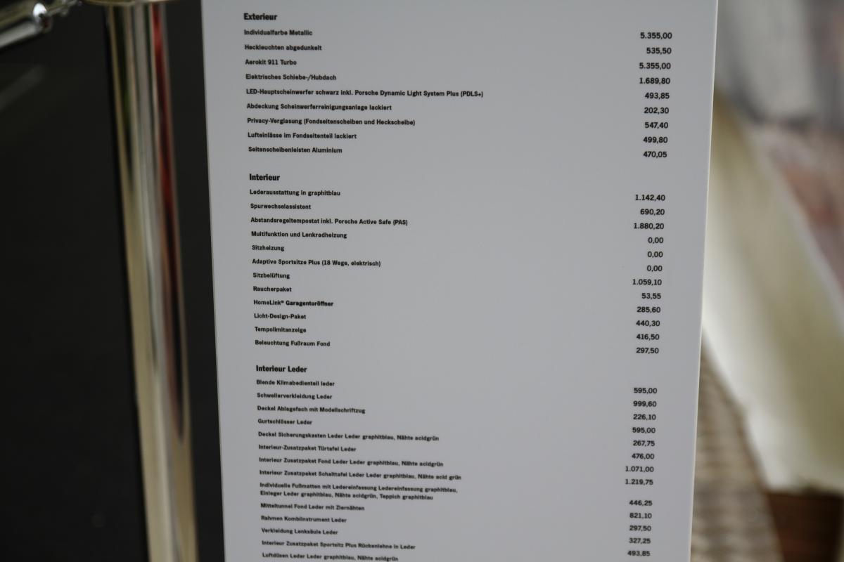 Hier mal ein Beispiel für einen richtig teuren Porsche aus der Exclusive Abteilung (991.2 Turbo S beim OGP 2017) inklusive Auflistung der Sonderposten und Preise: