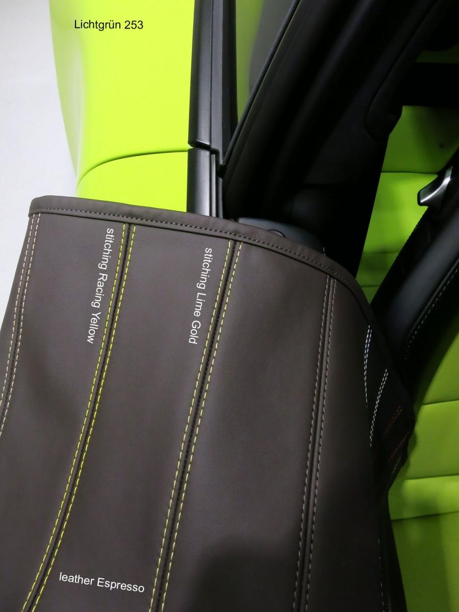 Ziernähte in abweichender Farbe kostet über Porsche-Exclusive 2.975 Euro, dort hat man dann jedoch "nur" eine beschränkte Auswahl an Farben. Wer auch hier abweichen will, kann dies natürlich auch tun, der Preis dafür ist mir nicht bekannt. Für Sitze in Leder, das nicht im Standardprogramm erhältlich ist, habe ich mal eine Hausnummer von rund 5.000 Euro mitbekommen. Pepita Inlays in den Sportschalen kosten übrigens rund 3.000 Euro.