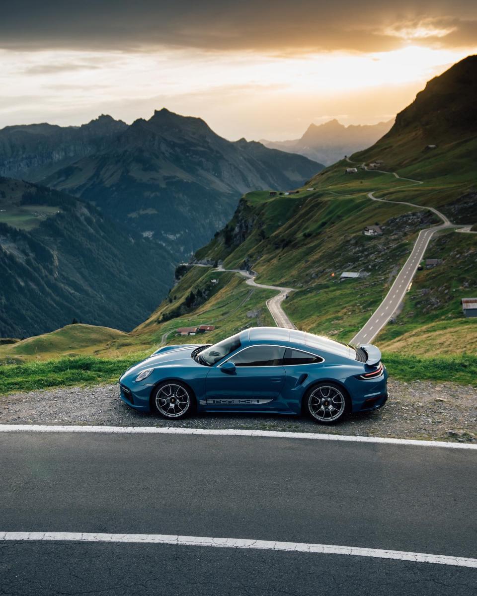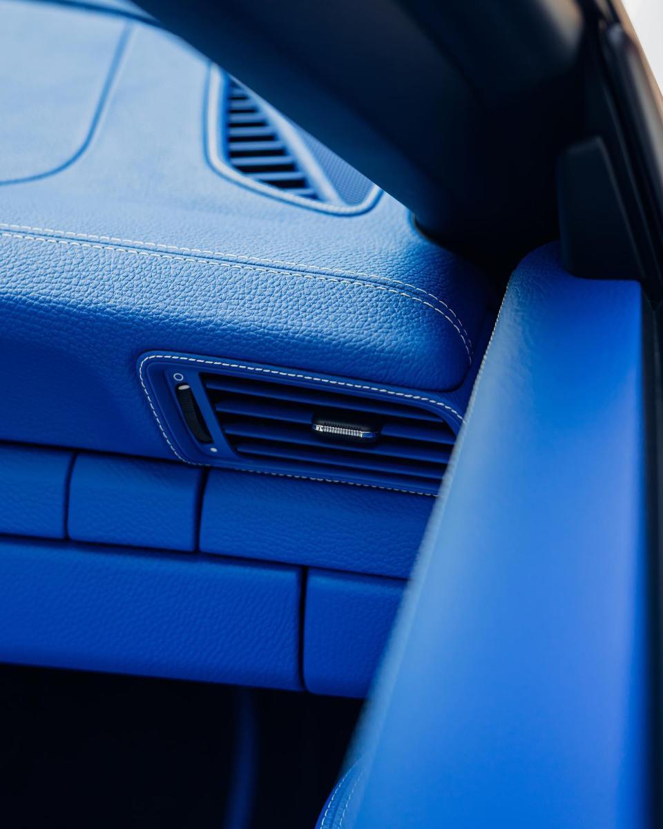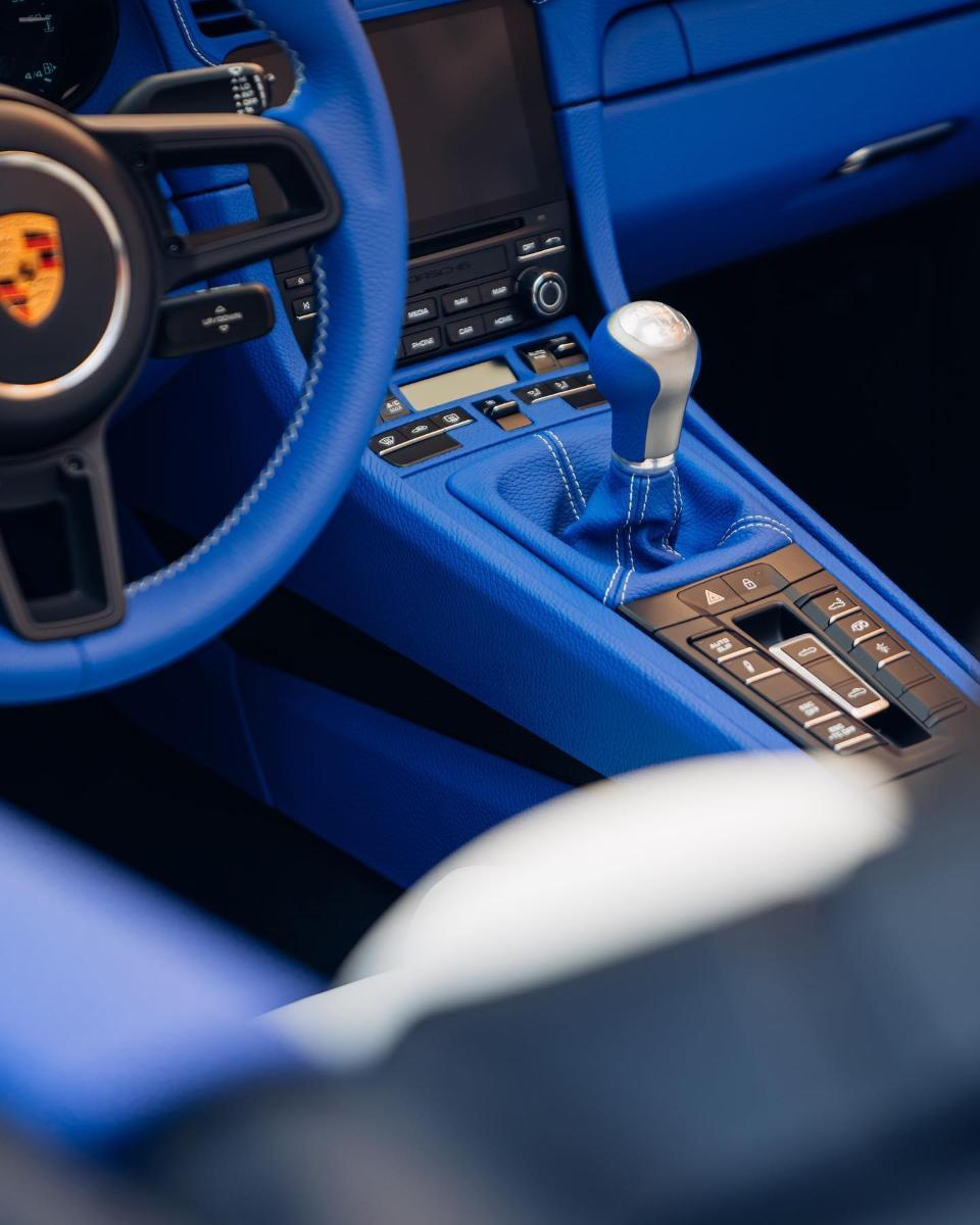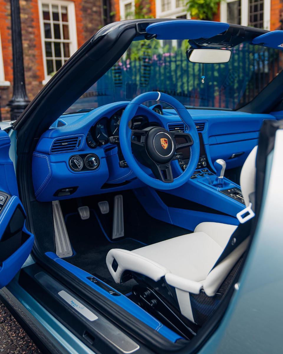 992 Turbo S in PTS Osloblau mit Lederpaket 930 und Rückenlehne Leder mit Dekorelement Paldao dunkel offenporig durch Porsche Exklusive Manufaktur.
