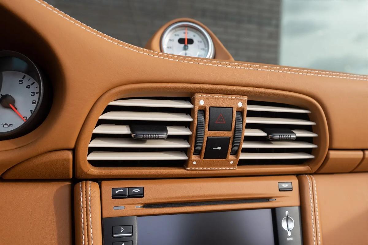 Was weiterhin für eine Drittanbieter-Lösung (und ausserdem Einzelanfertigung) spricht, zeigt sich im ersten Bild. Denn im 993 mit Holz-Interieur und dunklem Leder ist der obere Rahmen der Konsole sichtbar angesetzt. Im unteren Bereich der Konsole (im Beinbereich) hingegen fehlt die zusätzliche Klappe, wie sie im Fahrzeug mit dem gelben Leder gut sichtbar ist.