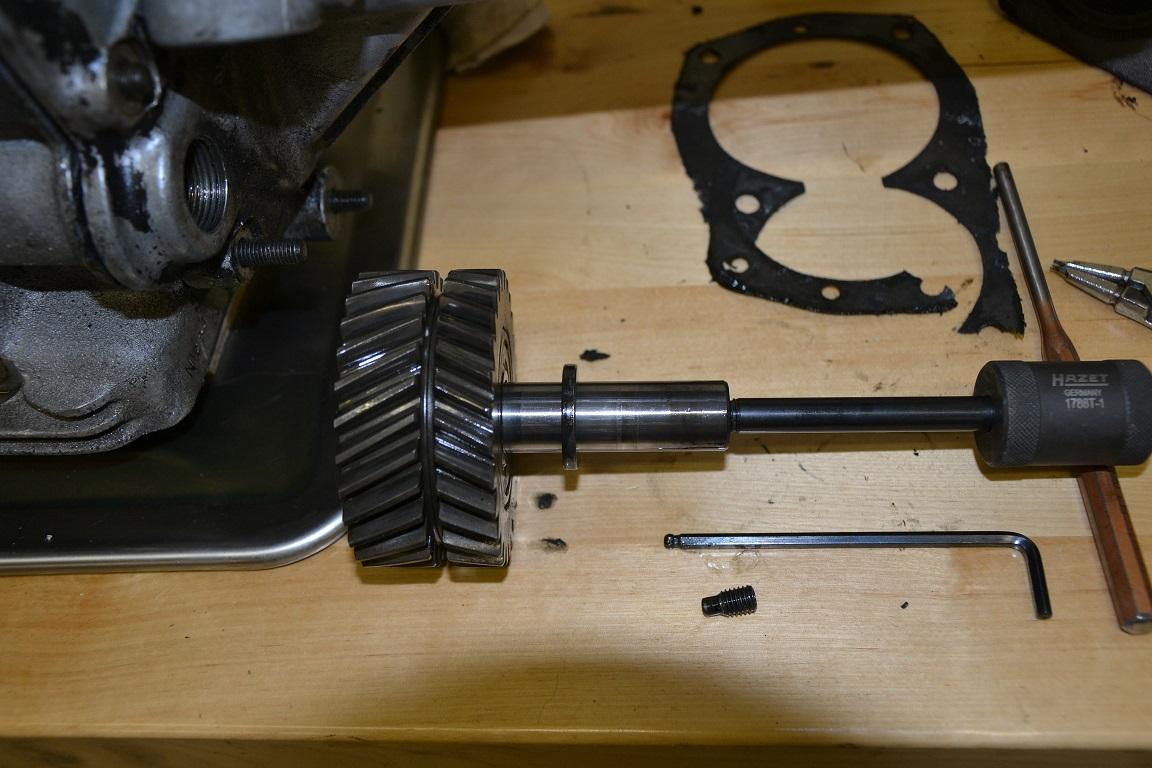 Zunächst wird die Welle für den Rückwärtsgang ausgebaut. Dazu benötigt man einen 6 mm Inbus, sowie einen Auszieher, dessen Stange am distalen (vorderen ;)) Ende mit einem M10 Gewinde versehen ist. Rest siehe Bilder.