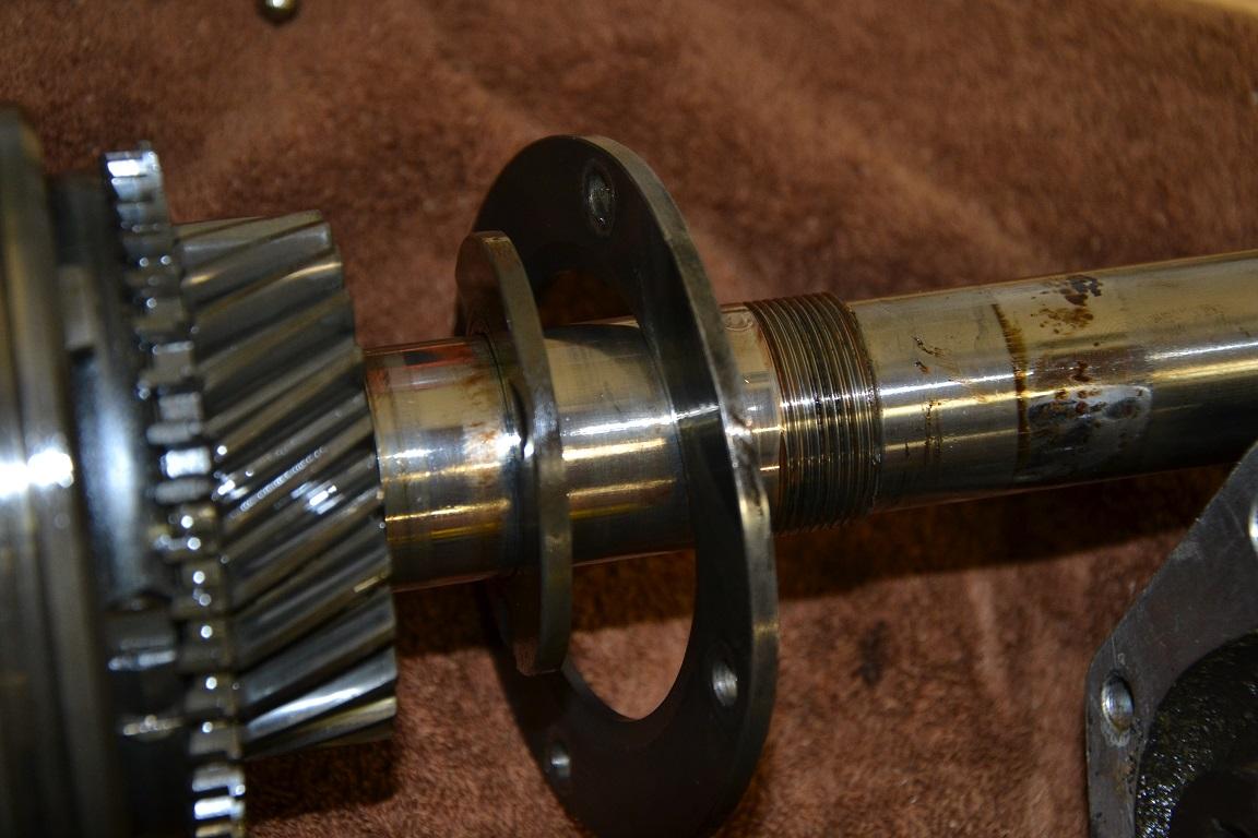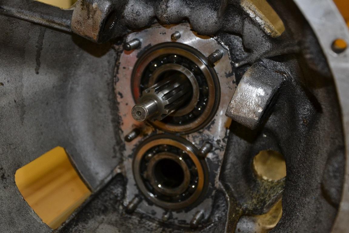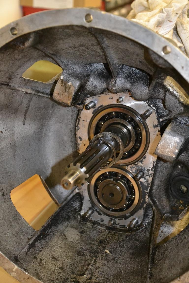 Kardanseitig kann der Flansch einfach heraus gezogen werden, sein Rohr mit Innerverzahnung läuft auf einer Längsverzahnung der Getriebewelle und wird am Gehäuseende von einem Rollenlager geführt, dessen Rollen auf der Außenseite des Rohres des Flansches laufen (keine innere Lagerschale des Lagers). Das Rollenlager muss mittels eines Abziehers ausgezogen werden. Hierzu empfiehlt sich ein Lagerauszieher, für welchen man zwei L-förmige Arme baut. Diese werden zwischen Welle und Lager eingeführt und um 90° gedreht, so dass sie die Rollen und die äußere Schale hintergreifen. Dann klappts.