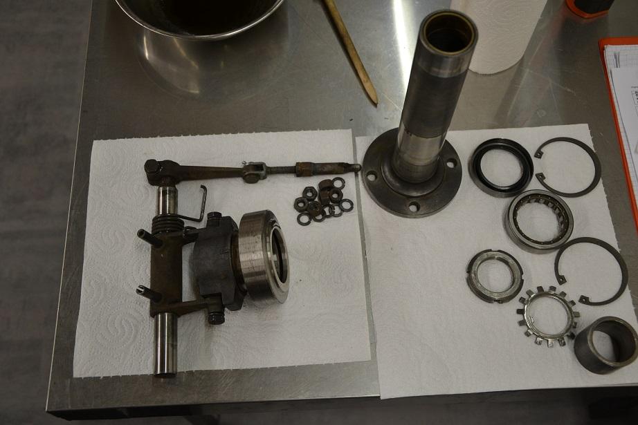 So, und dann nur noch die Hauptwelle zerlegen, alle Teile putzen und richtig wieder zusammensetzen. So wird es dann bis zum Zusammenbau gelagert. Die Hauptwelle besteht aus zwei Teilwellen, welche einfach ineinander geschoben sind (mit Nadellager gegeneinander gelagert)