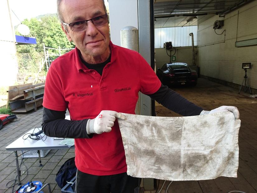 Sodele, nun auch den Innenraum auf Neuzustand  gebracht. Nicht durch mich, sondern durch DEN Profi. Seht nur was nach 11 Jahren Nutzung am Lappen hängen geblieben ist. Es fällt mir schwer, nun in den blitzblanken Masi zu steigen. Geht wahrscheinlich nur mit fabrikneuen Schuhen und Anzug:(.