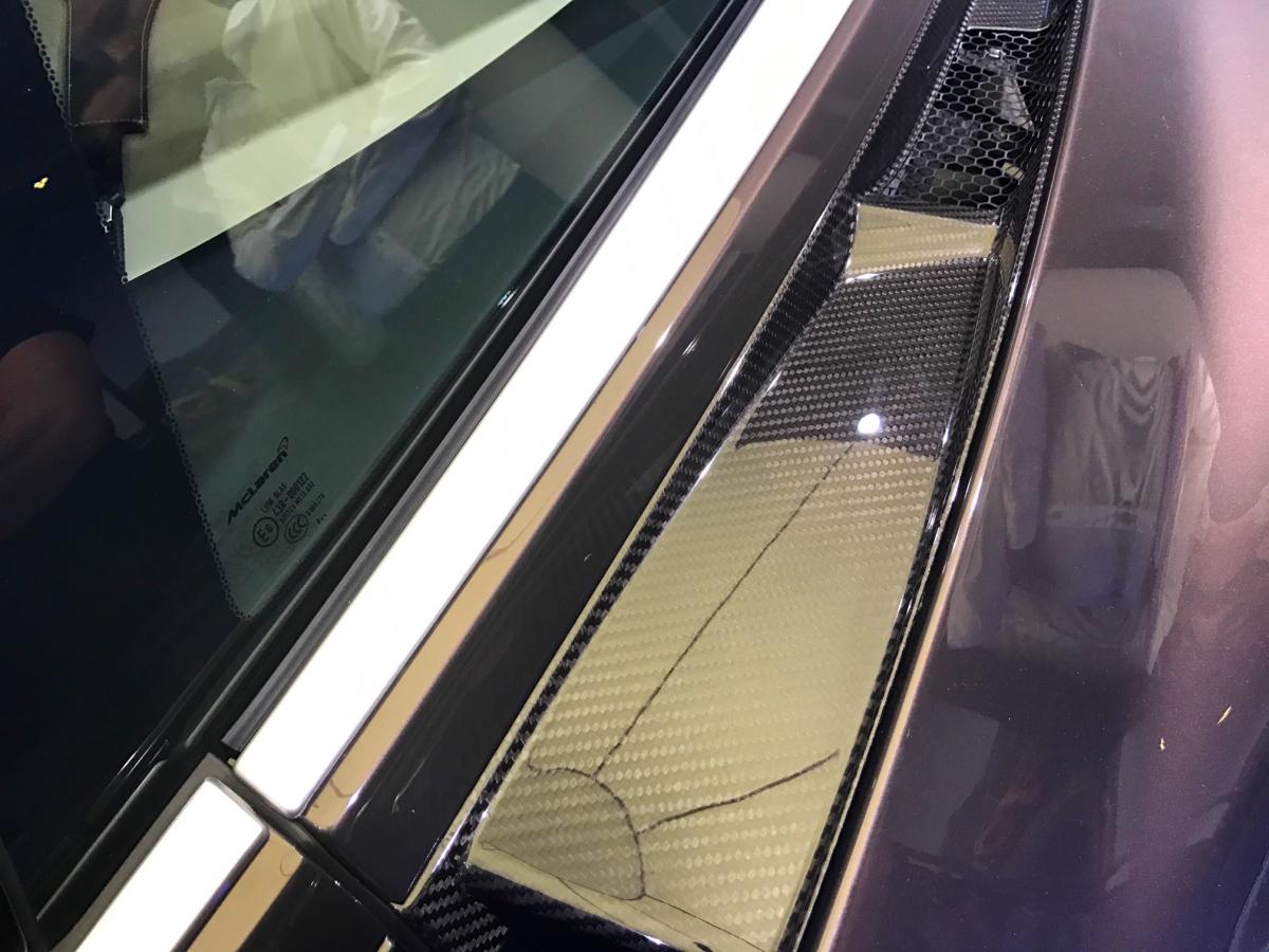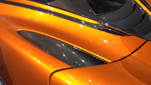 Der Messewagen ist der erste MSO (McLaren Special Operations) und ist nicht wirklich komplett dunkelrot. Man sieht es meistens nicht auf den Bildern. Aber der Wagen hat vorne eine Sichtcarbon Fronthaube und Sichtcarbon in dunkelrot. Nach hinten hin wird das rot heller und endet am Heck mit dem auf den Bildern sichtbaren knallrot und vor allem aber dann in Voll-Lack, also ohne Sichtcarbon - zusätzlich natürlich das schwarze (Glas-) Dach. MSO hat es also geschafft den kompletten Wagen so genau zu lackieren, dass der Übergang von Sichtcarbon auf Lack nicht sichtbar ist.