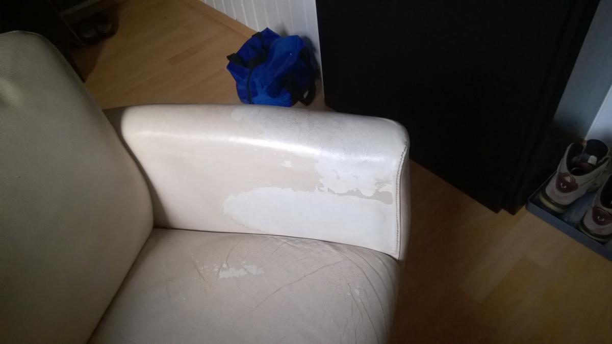 So, wieder mal das eingetreten was so oft passiert: Meine Mutter hat Ihr Hausmittel angewendet. Irgend eine alte Glasflasche mit der "alles abgeht" O-Ton Mama. Die Jeansfarbe ging genauso weg wie die Farbe des Leders......... schnief. Und ich sach noch, Mama warte. Ich mach den Sessel selbst sauber......