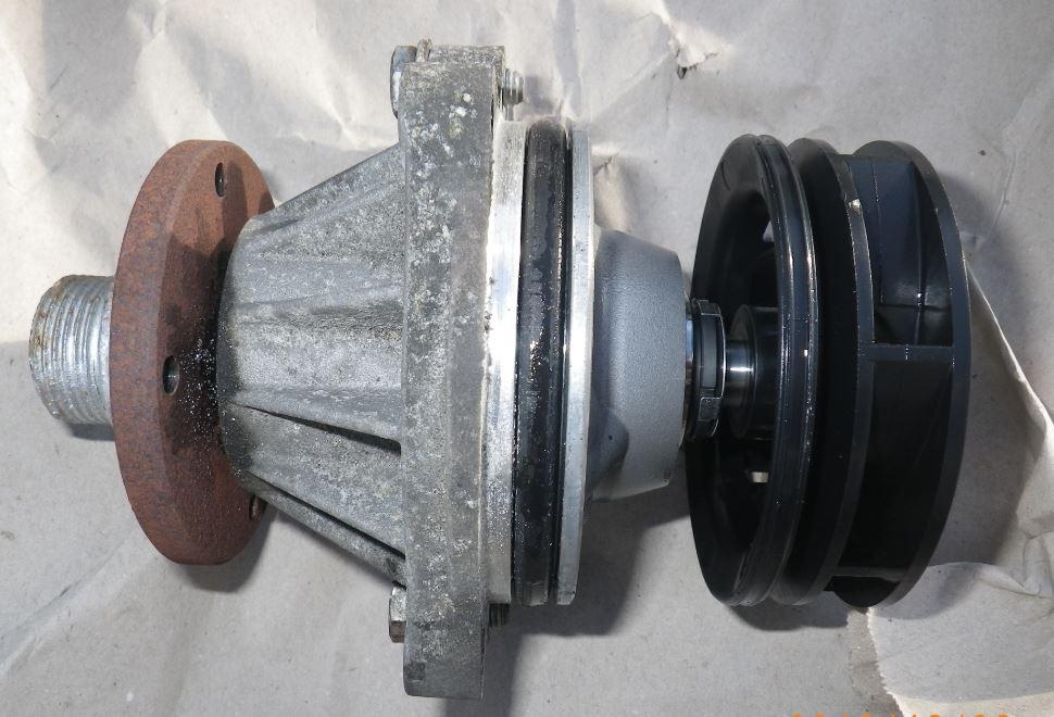 jetzt mal die Original-BMW-Wasserpumpe angeschaut. Diese hat tatsächlich Kunststoffschaufeln. Diese sind aber völlig ok. Da ist nix abgeschreddert: