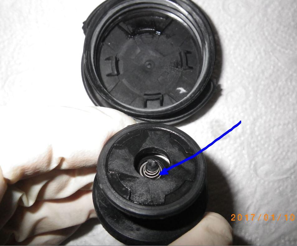 Das Durchpusten ging dann bereits nicht mehr so einfach. Die Feder, die für den Überdruck 2 bar zuständig ist, war einwandfrei. Da ist aber noch eine kleine schwache Feder für Unterdruckausgleich. Wieder gewaschen mit gedrückter Feder.