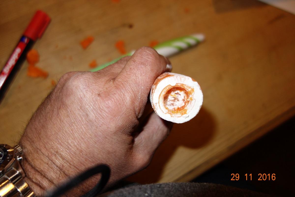 Genau, eine feste Bio-Karotte, sauber abgeschnitten und etwas ausgehöhlt und den Rand auf die Auskerbungen pressen zu können,