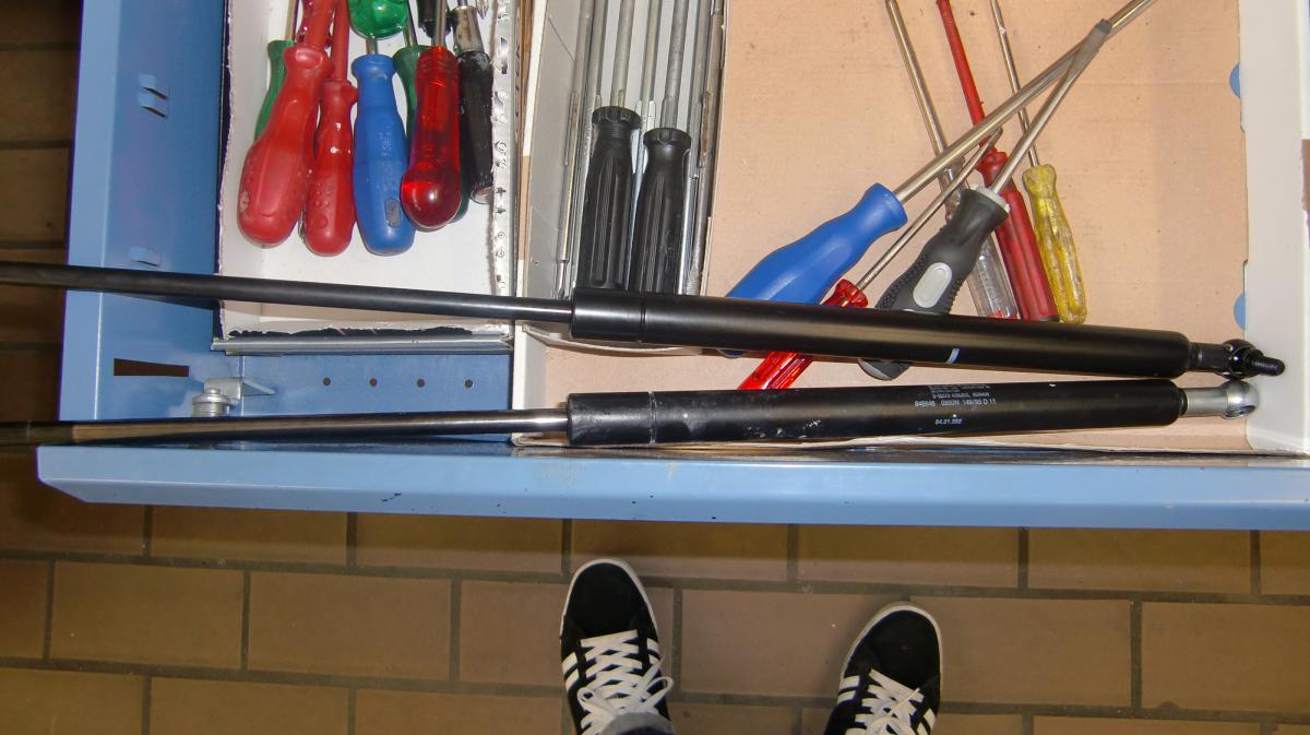 Jetzt drin ist die Stabilus 6736NT mit 1060 N  (Ende 2016 produziert). Diese ist also bereits kräftiger. Das ist die einzige von Stabilus für den Diablo ausgewiesene Gasfeder.