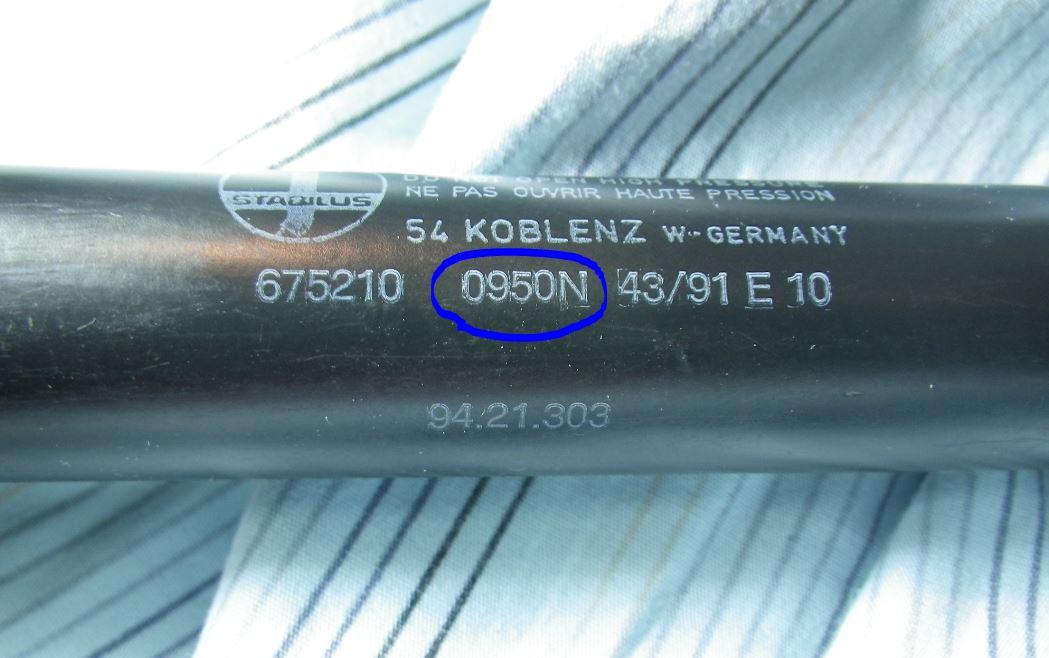 Bei meinem Auto war die Original-Gasfeder Stabilus 675210 mit 950 N  (wohl KW 43 1991 produziert) verbaut: