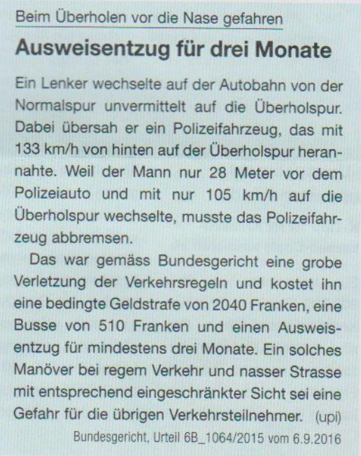 Der Polizei (CH) vor die Nase gefahren (2500 CHF/3 Monate Ausweis weg)