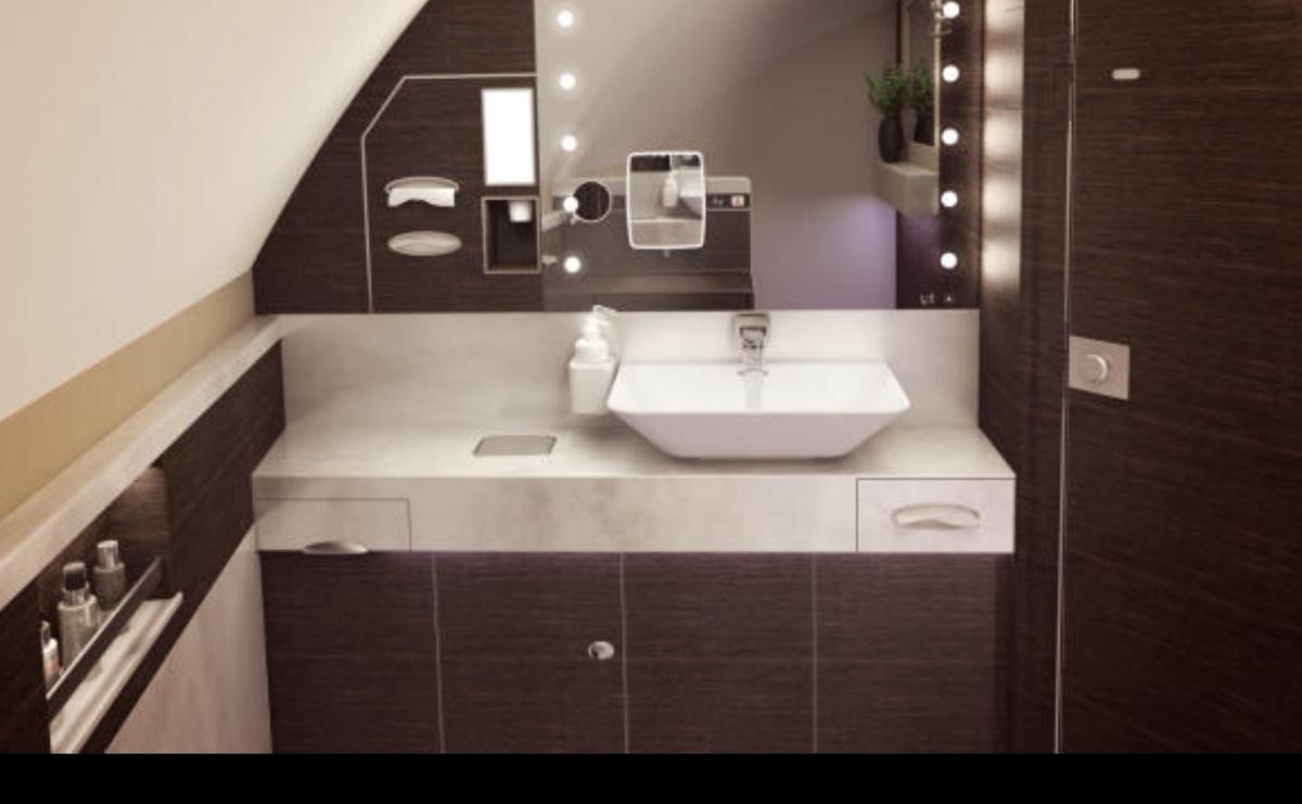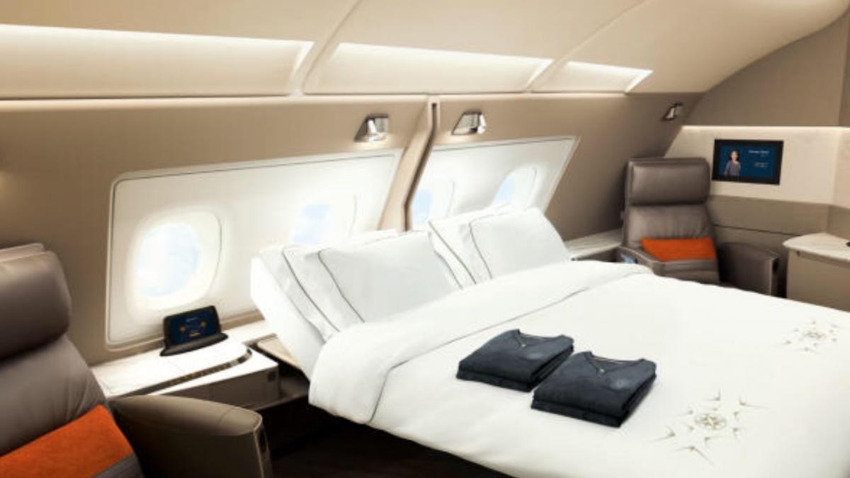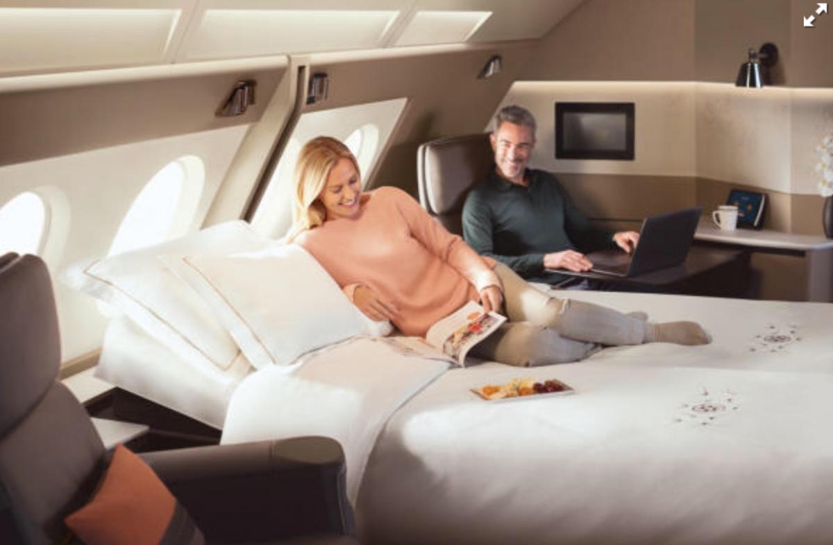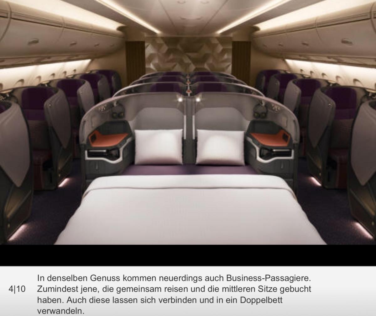 Das eine Foto zeigt die Business Class mit dem Doppelbett.