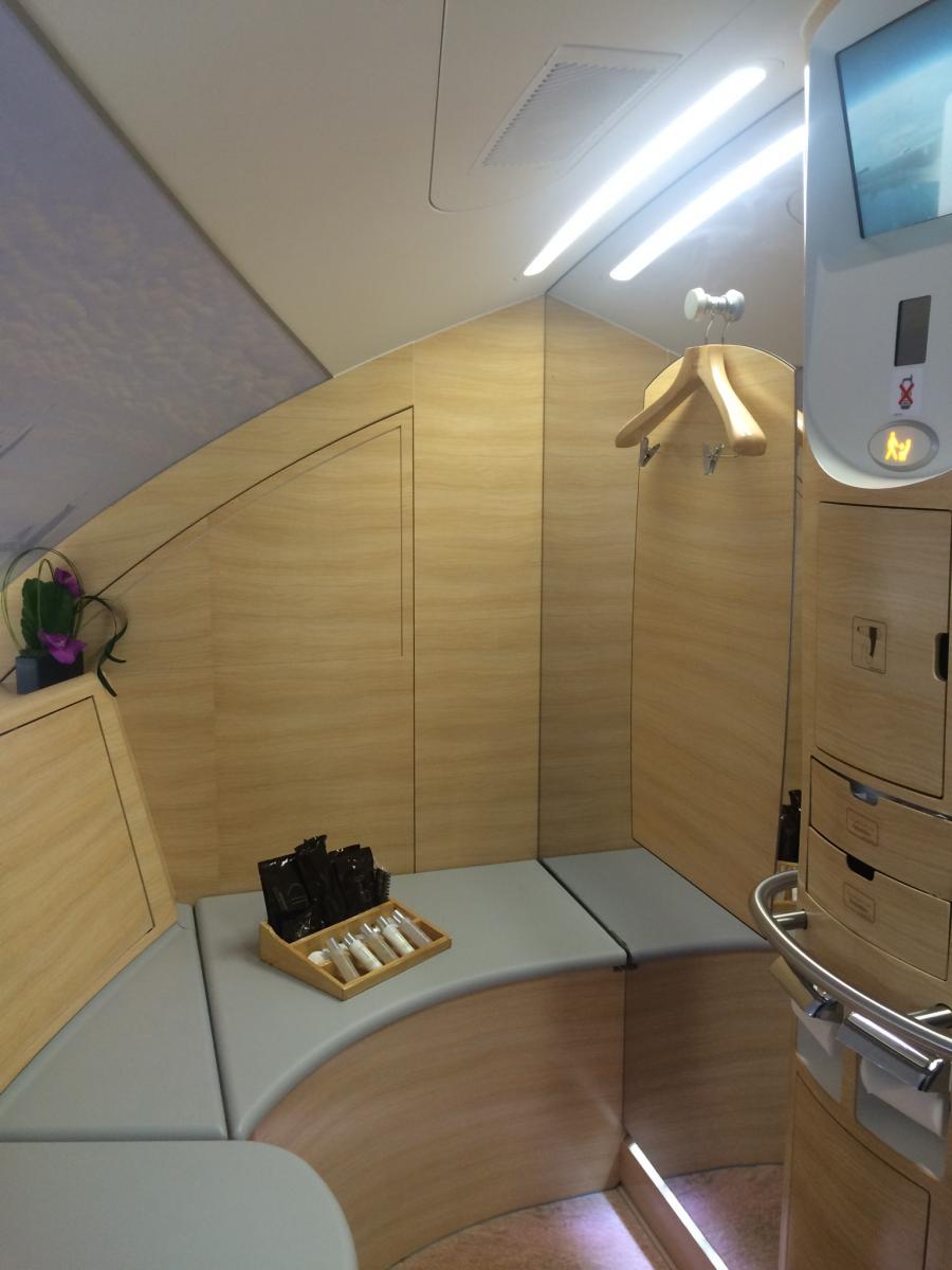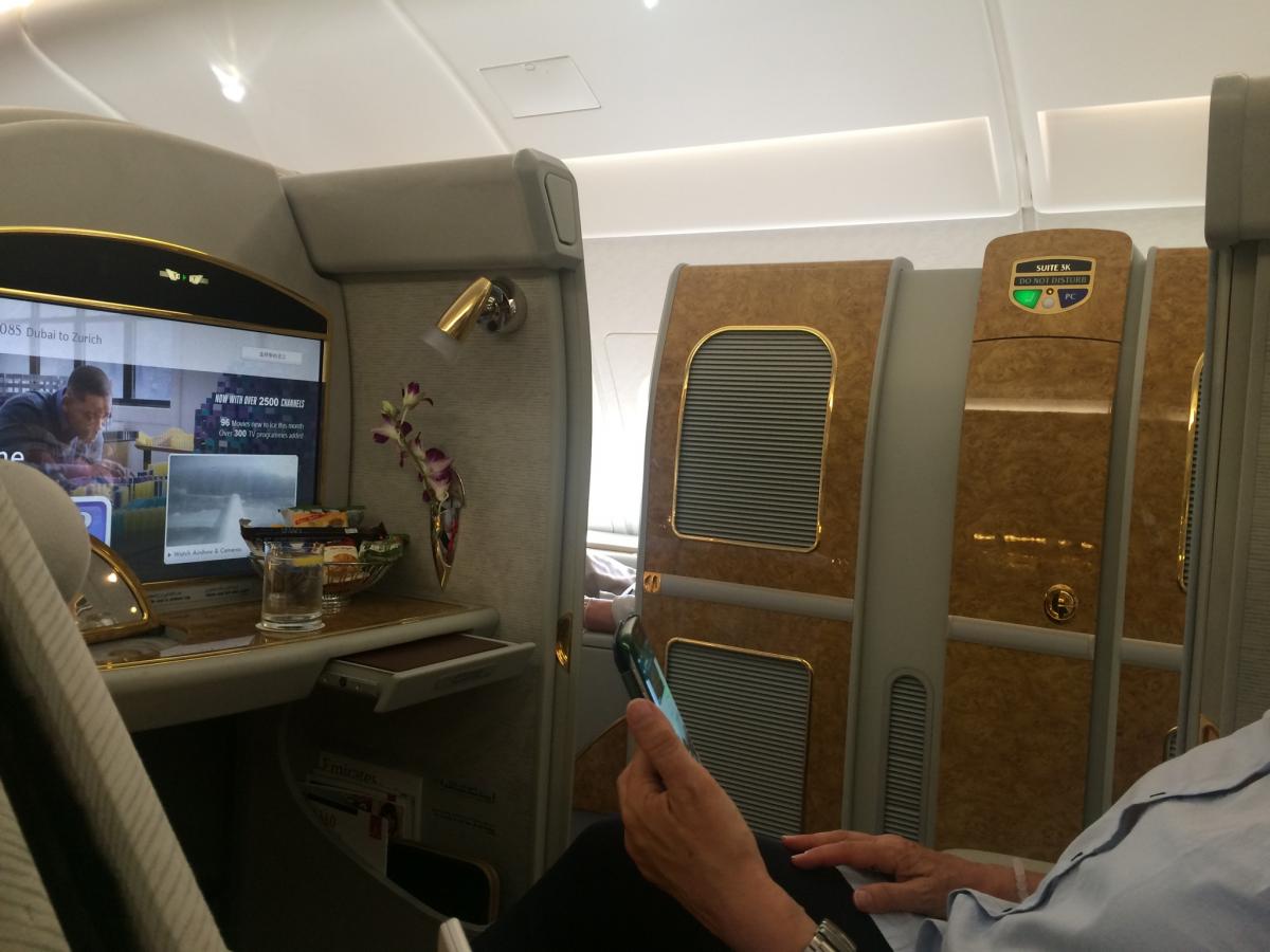 Wir sind letztens mit Emirates in der First geflogen. Dort mögen die absolute Privatsphäre. Man macht die Tür von seiner Kabine zu und ist wirklich für sich alleine. Keiner schaut zu, wie du schläfst.