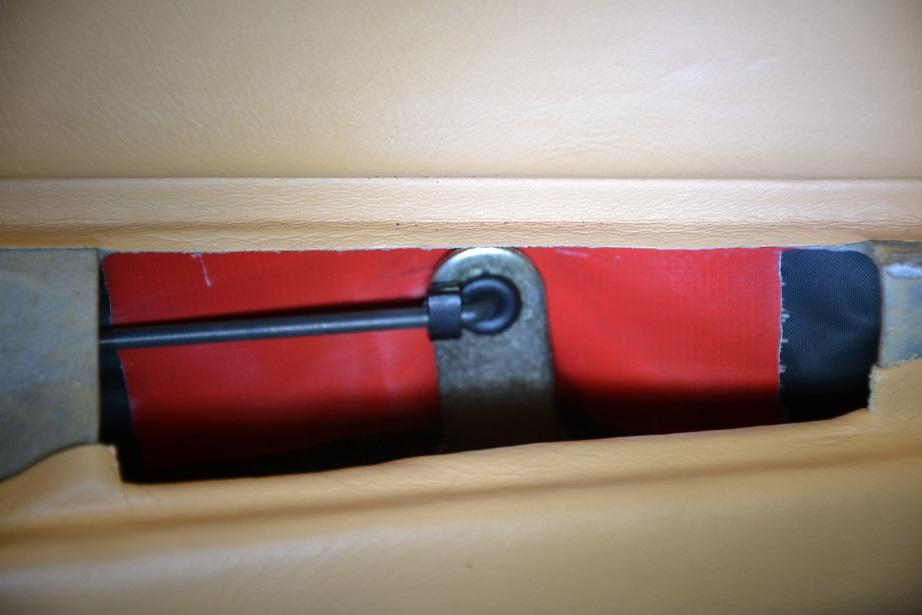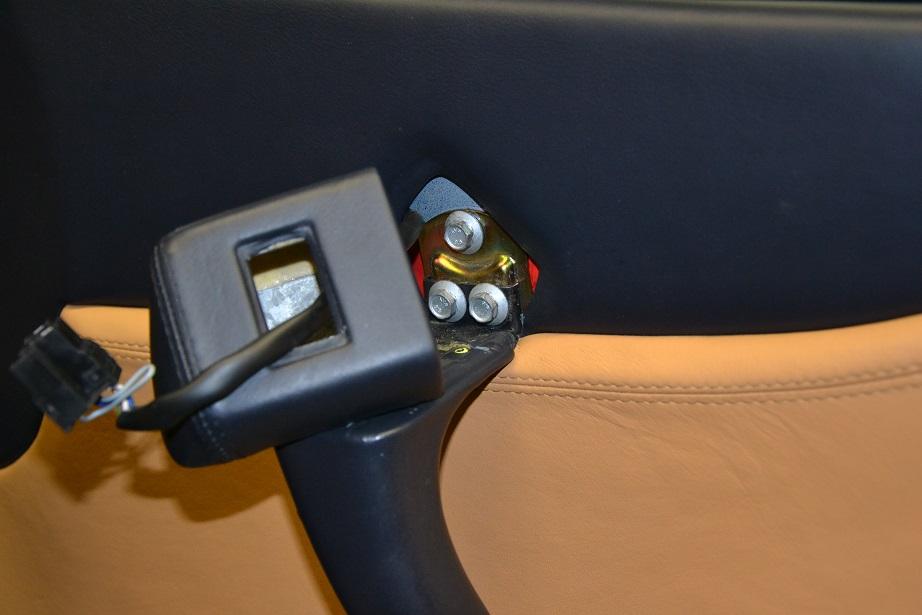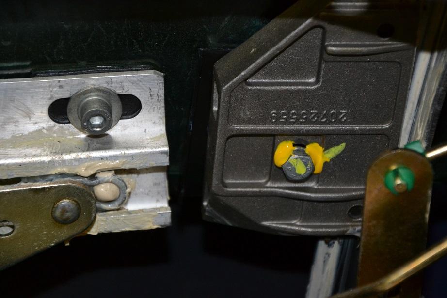 Dann ist wohl meist diese Schraube locker (dort, wo der gelbe Sicherungslack erkennbar ist). Im Folgenden wird der Zusammenbau der Türinnenverkleidung dargelegt, das Zerlegen geht umgekehrt.