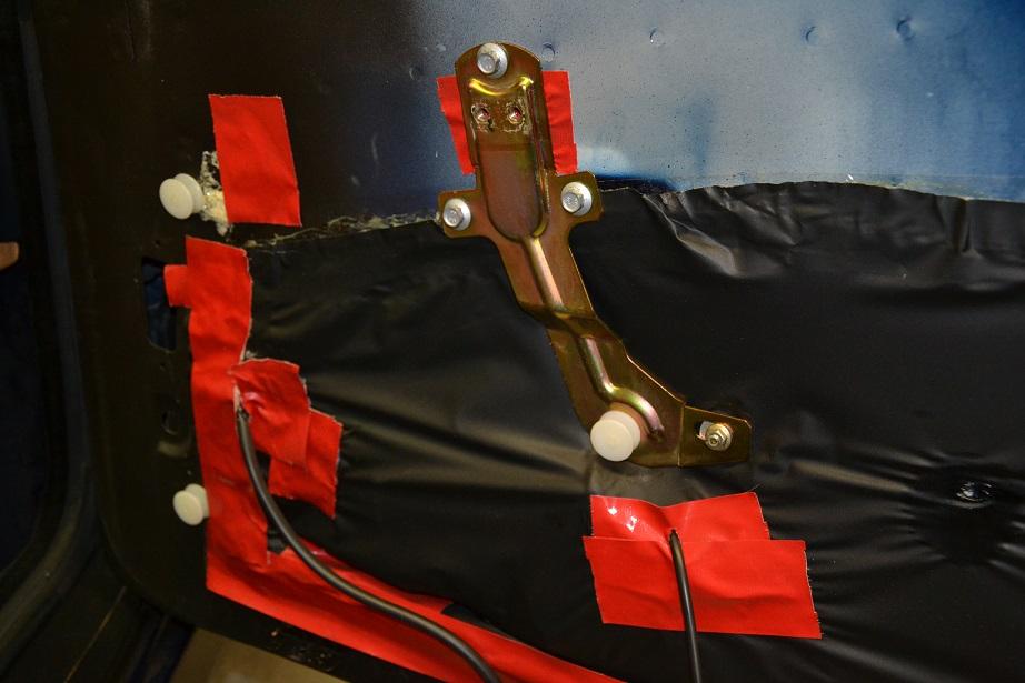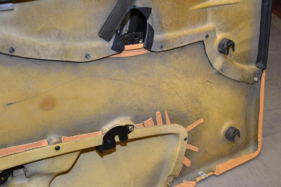 In diese greifen die Gegenstücke der Innenverkleidung ein. Dazu wird die Innenverkleidung von oben auf alle fünf Halter aufgeschoben. Das funktioniertganz gut mit noch nicht montierter Fensterschachtdichtung (innen). Zuvor nicht vergessen, den elektrischen Verbinder für die Zentralverriegelungssteuerung vom Betätigungshebel der Verriegelung anzuschließen und den Stecker des Fensterhebers einzufädeln.