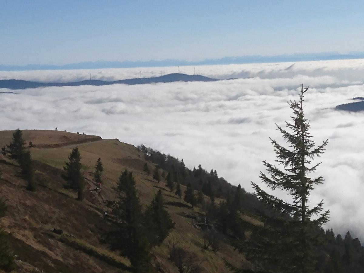 Belchen im Schwarzwald über dem Nebel. In den Schattenlagen wird es schon empfindlich kalt und nass.