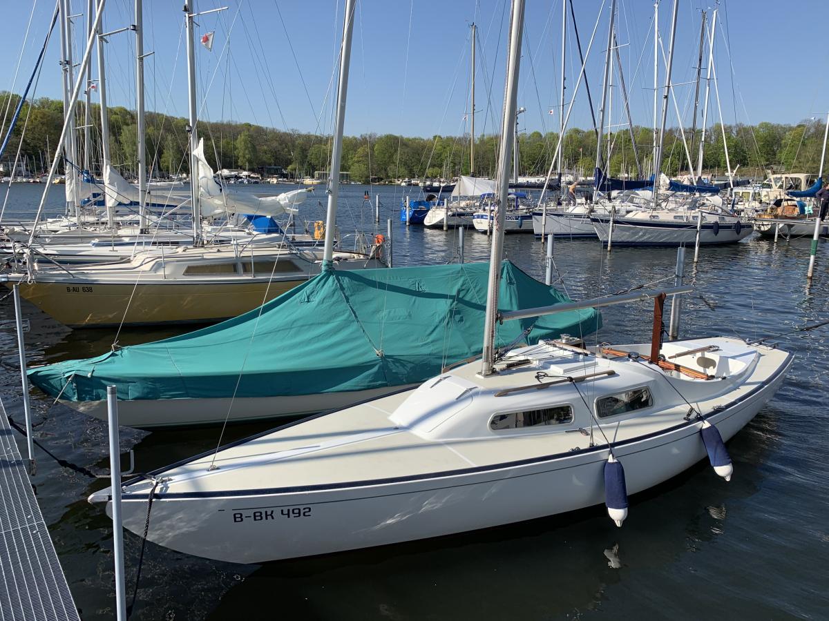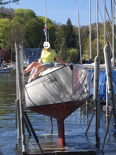 So, jetzt kann die Saison beginnen, sie schwimmt, das Deck ist geschrubbt, der Rumpf poliert, der Mast steht und der Baum ist montiert!