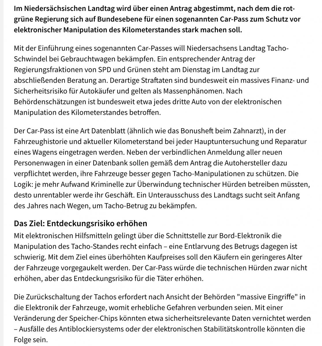Ein verbindliches Pflichttool wie Carfax in den USA sollte der Carpass, wie er in Niedersachsen kommen soll, in Deutschland auch werden. Da werden die Datenschützer zwar wieder Sturm laufen, aber der volkswirtschaftliche Schaden ist dermaßen hoch, dass ich das System unterstützen würde. Übrigens empfiehlt der AvD ebenfalls die Einführung des "Car-Pass" Systems.