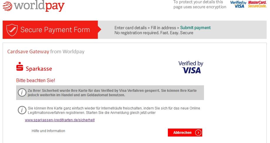 ok...also schonmal (vor übrigens drei wochen!) auf der verlinkten seite den spezialcode angefordert um die karte wieder freizuschalten...zwei tage lang kam erstmal nichts (1 cent überweisung mit pin als zahlungshinweis) und dann rief doch tatsächlich eine nette an um mir mitzuteilen dass ich per post eine pin bekomme mit der ich der karte eine selbst zu vergebende pin verpassen kann damit sie wieder funktioniert.ok...kam dann auch und schon beim siebten oder achten versuch hats die, jungfräuliche weil niemals am automaten oder sonstwo verwendeten, karte endlich gefressen...da kam immer "technische probleme...melden sie sich am schalter"....wieder zuhause probiert...geht natürlich nicht weil ich noch die freischaltung für verified 3D schlagmichtot brauche...also nochmal die pin dafür angefordert welche auch tatsächlich nach zwei tagen auf dem ausug erscheint...wieder auf die seite zum registrieren.....braucht ne app....