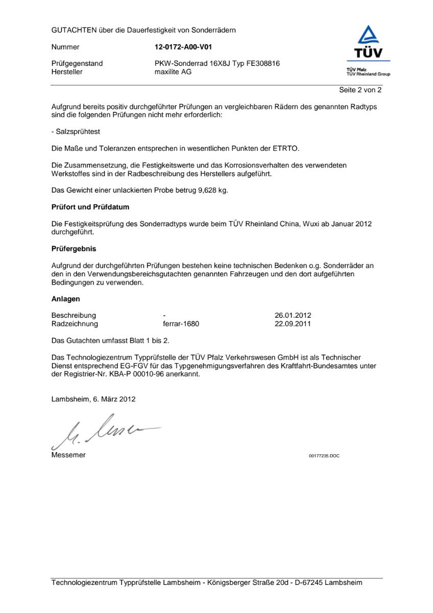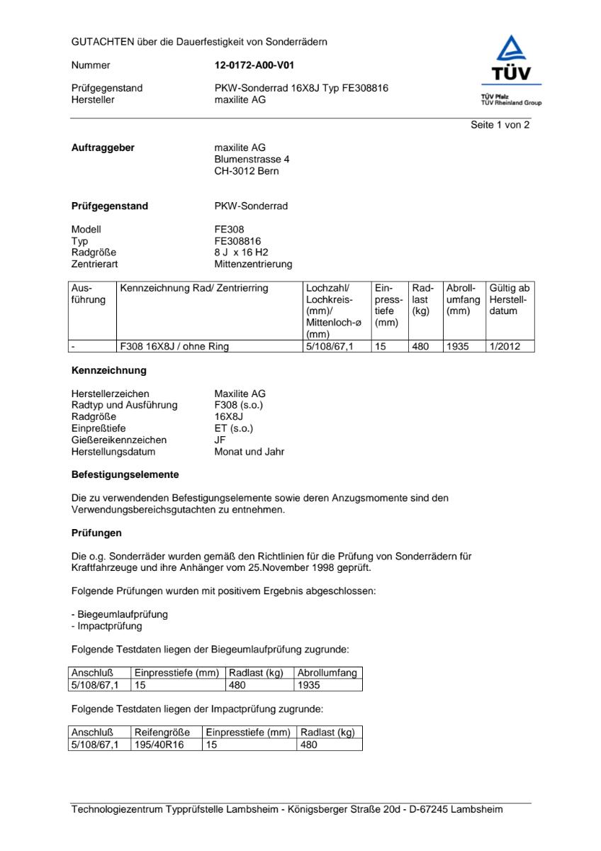Nein leider nicht, das Gutachten habe ich vom Händler bekommen,  er meinte das ist alles was er zu den Felgen hat. Habe auch bei Maxlite angefragt,  die haben auch nichts anderes mehr gefunden. Die Felgen sind vor knapp 10 Jahren produziert worden.