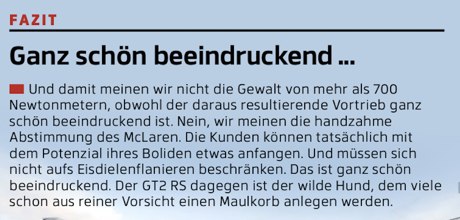 Fazit: Der Porsche ist in jeder, aber wirklich jeder Disziplin (ausser beim Preis) unterlegen. Und das obwohl der McLaren auf Pirelli Zero Corsa (nicht Trofeo!) unterwegs ist, während der Porsche Michelin Pilot Cup 2 montiert hat.