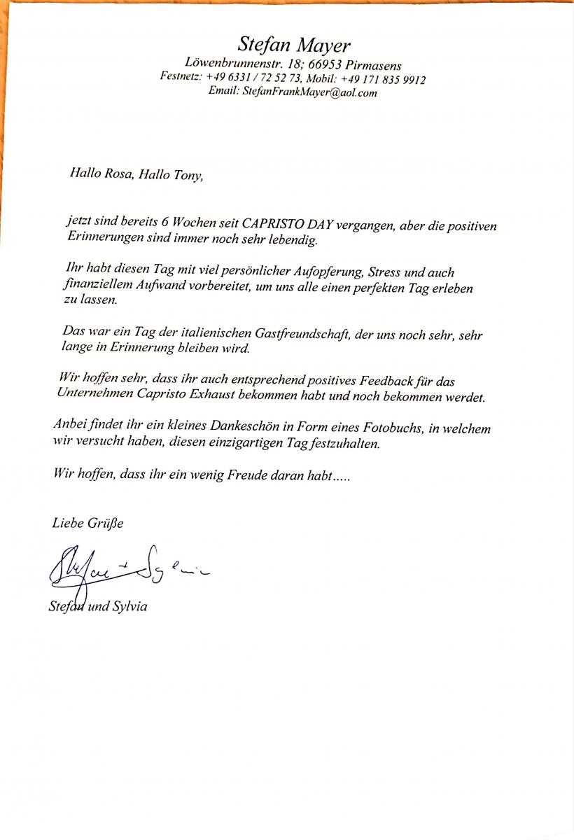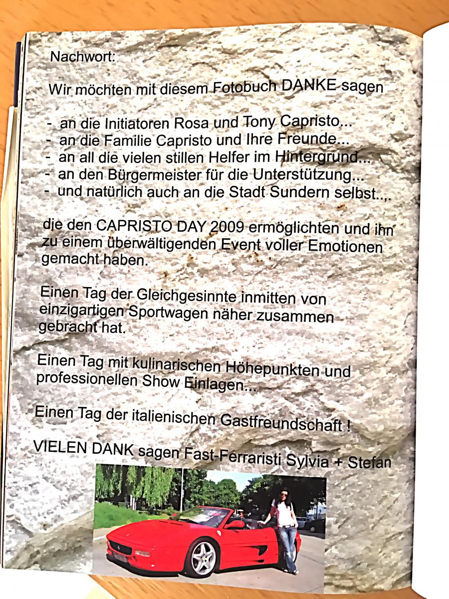 Ich freue mich schon jetzt auf die Neuauflage des legendären Capristo-Days, nette Teilnehmer, natürlich auf Tony, der meinen Maranello vor 6 Jahren wieder "flott" gemacht hat und auf den zum Scuderia aufgerüsteten F-430.