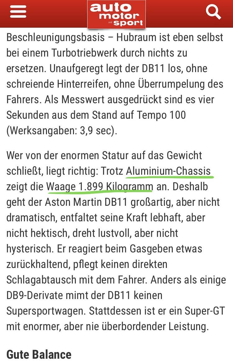 Der Aston Martin DB11 V12 hat im SportAuto Test ein Leergewicht von 1899kg plus 75kg Fahrer, ergibt ein EU Leergewicht von 1974kg. Finde ich gar nicht mal so schlecht für ein V12, ohne dass CFK im Chassis verbaut wurden ist. Der Vantage V8 (2017) liegt bei 1720 plus 75kg, also 1795kg EU Leergewicht, wie du ja schon erwähnt hast. Bleibt abzuwarten, was der BMW M850i xDrive wirklich nach EU Leergewicht auf die Waage bringt. Und das ist ja noch nicht mal der M8 - der könnte ja nochmal ein Stück schwerer werden.