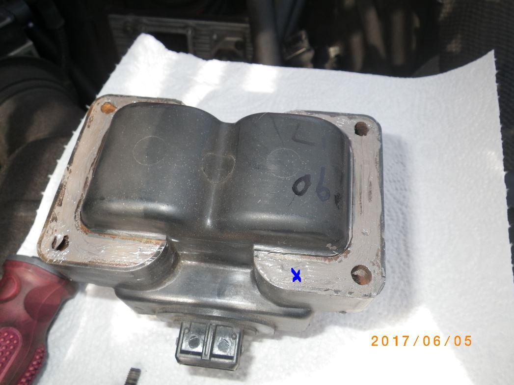 Die Wärmeleitpaste unter der ausgebauten Zündspule war nach vielen Jahren noch intakt. Dann auf die alte Originalzündspule wieder das Gleiche drauf: