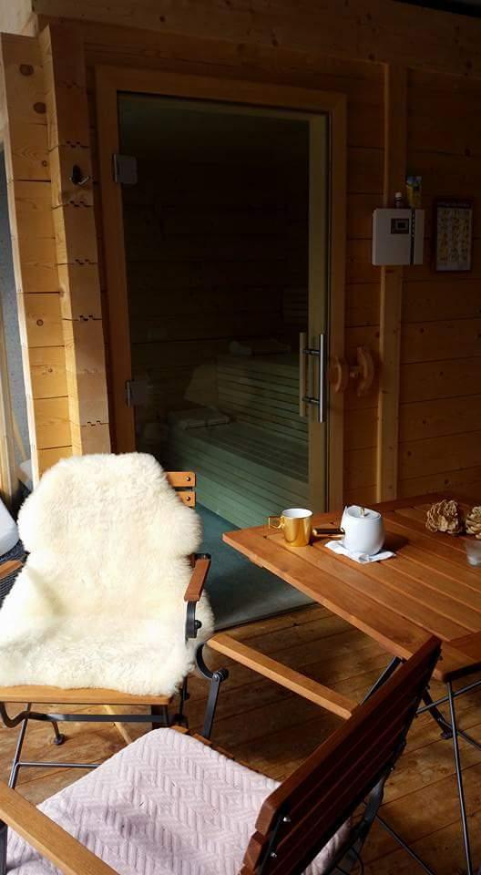 Und jede dieser Almhütten hat eine eigene Sauna mit Panoramablick und Notfallknopf, für alle Fälle.